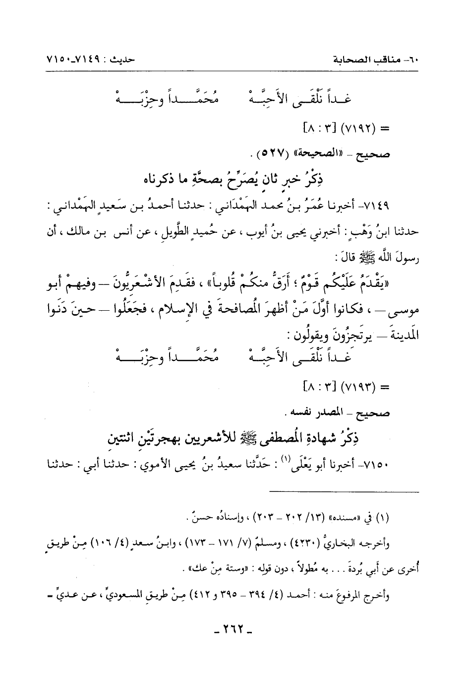 (يَقْدَمُ عَلَيْكُمْ قَوْمٌ أَرَقُّ مِنْكُمْ قُلُوبًا) فَقَدِمَ الْأَشْعَرِيُّونَ ـ وَفِيهِمْ أَبُو مُوسَى ـ فَكَانُوا أَوَّلَ مَنْ أَظْهَرَ الْمُصَافَحَةَ فِي الْإِسْلَامِ فَجَعَلُوا ـ حِينَ دَنَوَا الْمَدِينَةَ يَرْتَجِزُونَ وَيَقُولُونَ: