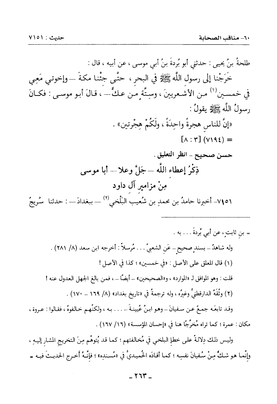 وليس ذلك دلالة على خطإ البلخي في مُخالفتهم , كما قد يُتوهْم من التخريج المشار إليه وإنما هو شكٌ من سفيان نفسه؛ كما أفاده الحميدي في ((مسنده))؛ فإنه أخرج الحديث فيه عنه (135/ 282)؛ كما رواه الجماعة , وعقَّب عليه بقوله: