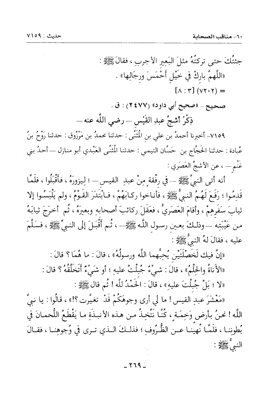 أَنَّهُ أَتَى النَّبِيَّ صَلَّى اللَّهُ عَلَيْهِ وَسَلَّمَ ـ فِي رُفْقَةٍ مِنْ عَبْدِ الْقَيْسِ ـ لِيَزُورَهُ فَأَقْبَلُوا فَلَمَّا قَدِمُوا رَفَعَ لَهُمُ النَّبِيُّ صَلَّى اللَّهُ عَلَيْهِ وَسَلَّمَ فَأَنَاخُوا رِكَابَهُمْ فَابْتَدَرَ الْقَوْمُ وَلَمْ يَلْبَسُوا إِلَّا ثِيَابَ سَفَرِهِمْ وَأَقَامَ الْعَصَرِيُّ فَعَقَلَ رَكَائِبَ أَصْحَابِهِ وَبَعِيرَهُ ثُمَّ أَخْرَجَ ثِيَابَهُ مِنْ عَيْبَتِهِ ـ وَذَلِكَ بِعَيْنِ رَسُولِ اللَّهِ صَلَّى اللَّهُ عَلَيْهِ وَسَلَّمَ ـ ثُمَّ أَقْبَلَ إِلَى النَّبِيِّ صَلَّى اللَّهُ عَلَيْهِ وَسَلَّمَ فسلَّم عَلَيْهِ فَقَالَ لَهُ النَّبِيُّ صَلَّى اللَّهُ عَلَيْهِ وَسَلَّمَ: