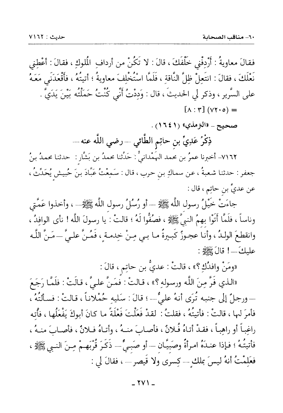 7162 - أَخْبَرَنَا عُمَرُ بْنُ مُحَمَّدٍ الْهَمْدَانِيُّ حَدَّثَنَا مُحَمَّدُ بْنُ بَشَّارٍ حَدَّثَنَا مُحَمَّدُ بْنُ جَعْفَرٍ حَدَّثَنَا شُعْبَةُ عَنْ سِمَاكِ بْنِ حَرْبٍ قَالَ: سَمِعْتُ عَبَّادَ بْنَ حُبَيْشٍ يُحَدِّثُ عَنْ عَدِيِّ بْنِ حَاتِمٍ قَالَ: