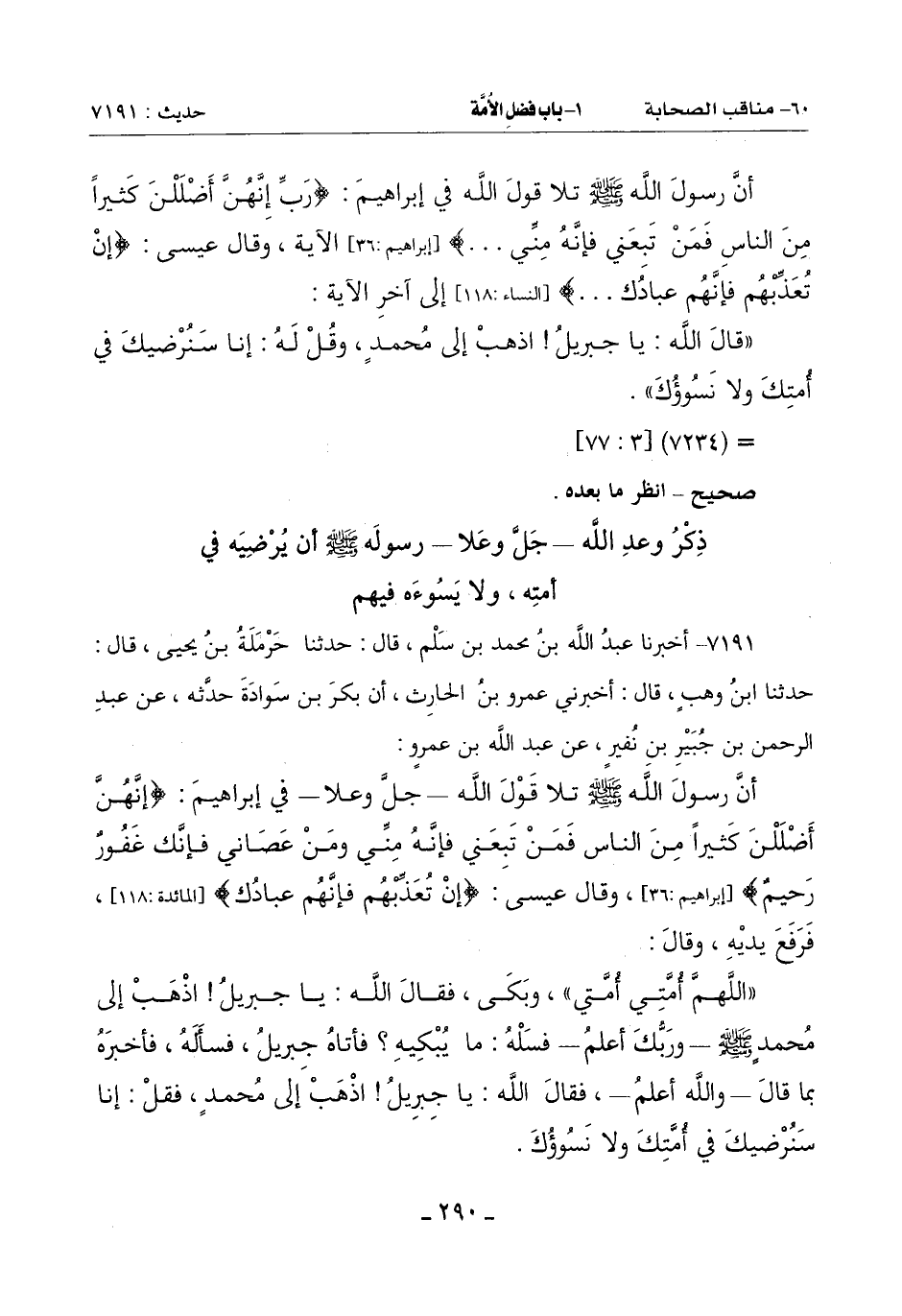 (اللَّهُمَّ أُمَّتِي أُمَّتِي) وَبَكَى فَقَالَ اللَّهُ: يَا جِبْرِيلُ اذْهَبْ إِلَى مُحَمَّدٍ صَلَّى اللَّهُ عَلَيْهِ وَسَلَّمَ ـ وَرَبُّكَ أَعْلَمُ ـ فسَلْهُ مَا يُبْكِيهِ؟ فَأَتَاهُ جِبْرِيلُ فَسَأَلَهُ فَأَخْبَرَهُ بِمَا قَالَ وَاللَّهُ أَعْلَمُ فَقَالَ اللَّهُ: يَا جِبْرِيلُ اذْهَبْ إِلَى مُحَمَّدٍ فَقُلْ: إِنَّا سَنُرْضيك فِي أُمَّتِكَ وَلَا نَسُوؤُكَ -[291]-