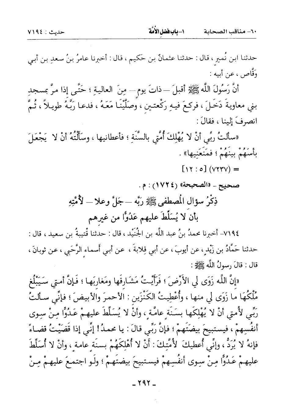 (إِنَّ اللَّهَ زَوَى لِيَ الْأَرْضَ فَرَأَيْتُ مَشَارِقَهَا وَمَغَارِبَهَا فَإِنَّ أُمَّتِي سَيَبْلُغُ مُلكها مَا زَوَى لِي مِنْهَا وأُعطيت الْكَنْزَيْنِ: الْأَحْمَرَ وَالْأَبْيَضَ فَإِنِّي سَأَلْتُ رَبِّي لِأُمَّتِي أَنْ لَا يُهلكها بِسَنَةٍ عَامَّةٍ وَأَنْ لَا يُسلِّط عَلَيْهِمْ عَدُوًّا مِنْ سِوَى أَنْفُسِهِمْ فَيَسْتَبِيحَ بَيْضَتَهُمْ فَإِنَّ رَبِّي قَالَ: يَا مُحَمَّدُ إِنِّي إِذَا قَضَيْتُ قَضَاءً فَإِنَّهُ لَا يُرَدُّ وَإِنِّي أُعطيك لِأُمَّتِكَ أَنْ لَا أُهلكهم بسنَةٍ عَامَّةٍ وَأَنْ لَا أُسلِّط عَلَيْهِمْ عَدُوًّا مِنْ سِوَى أَنْفُسِهِمْ فَيَسْتَبِيحَ بَيْضَتَهُمْ وَلَوِ اجْتَمَعَ عَلَيْهِمْ مِن -[293]- أَقْطَارِهَا ـ أَوْ قَالَ: من بين أقطارها ـ حتى يكون بعضهم يُهلك بَعْضًا وَيَسْبِي بَعْضُهُمْ بَعْضًا) قَالَ: قَالَ رَسُولُ اللَّهِ صَلَّى اللَّهُ عَلَيْهِ وَسَلَّمَ: