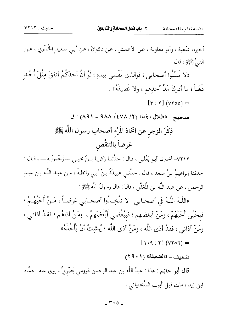 (اللَّهَ اللَّهَ فِي أَصْحَابِي لَا تَتَّخِذُوا أَصْحَابِي غَرَضًا مَنْ أحبَّهم فبِحُبِّي أَحَبَّهُم وَمَنْ أَبْغَضَهُمْ فبِبُغضي أَبْغَضَهُمْ وَمَنْ آذَاهُمْ فَقَدْ آذَانِي وَمَنْ آذَانِي فَقَدْ آذَى اللَّهَ وَمَنْ آذَى اللَّهَ يُوشِكُ أَنْ يَأْخُذَهُ)