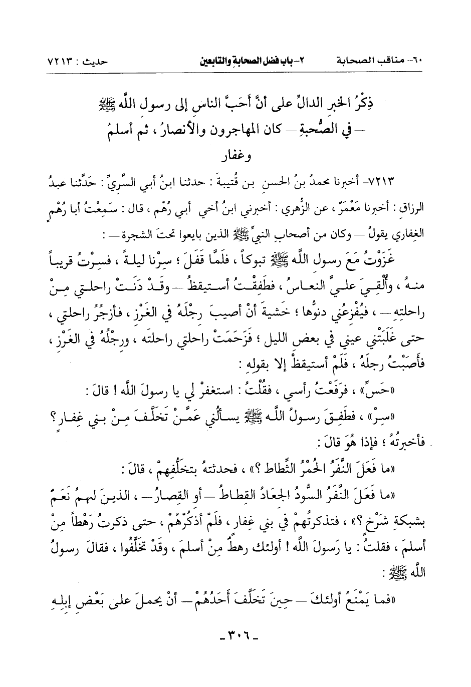 غَزَوْتُ مَعَ رَسُولِ اللَّهِ صَلَّى اللَّهُ عَلَيْهِ وَسَلَّمَ تبوكاً فَلَمَّا قَفَلَ سِرْنَا لَيْلَةً فَسِرْتُ قَرِيبًا مِنْهُ وأُلقي عَلَيَّ النُّعَاسُ فَطَفِقْتُ أَسْتَيْقِظُ وَقَدْ دَنَتْ رَاحِلَتِي مِنْ رَاحِلَتِهِ فيُفزعني دُنُوُّهَا خَشْيَةَ أَنْ أُصِيبَ رِجْلُهُ فِي الْغَرْزِ فَأَزْجُرُ رَاحِلَتِي حَتَّى غَلَبَتْنِي عَيْنِي فِي بَعْضِ اللَّيْلِ فَزَحَمَتْ رَاحِلَتِي رَاحِلَتَهُ وَرِجْلُهُ فِي الْغَرْزِ فَأَصَبْتُ رِجْلَهُ فَلَمْ أَسْتَيْقِظْ إِلَّا بِقَوْلِهِ: