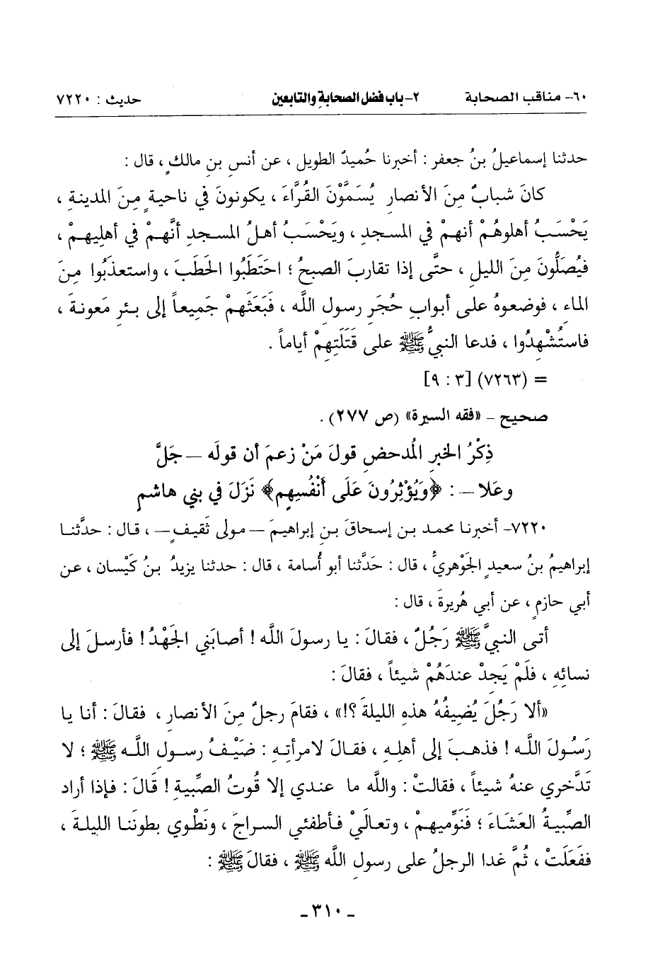 (أَلَا رَجُلٌ يُضيفُهُ هَذِهِ اللَّيْلَةَ؟ ) فَقَامَ رَجُلٌ مِنَ الْأَنْصَارِ فَقَالَ: أَنَا يَا رَسُولَ اللَّهِ فَذَهَبَ إِلَى أَهْلِهِ فَقَالَ لِامْرَأَتِهِ: ضَيْفُ رَسُولُ اللَّهِ صَلَّى اللَّهُ عَلَيْهِ وَسَلَّمَ لَا تَدَّخري عَنْهُ شَيْئًا فَقَالَتْ: وَاللَّهِ مَا عِنْدِي إِلَّا قُوتُ الصِّبْيَةِ قَالَ: فَإِذَا أَرَادَ الصِّبْيَةُ الْعَشَاءَ فَنَوِّميهم وَتَعَالِي فَأَطْفِئِي السَّرَّاجَ وَنَطْوِي بُطُونَنَا اللَّيْلَةَ فَفَعَلَتْ ثُمَّ غَدَا الرَّجُلُ عَلَى رسول الله صلى الله عليه وسلم فقال صَلَّى اللَّهُ عَلَيْهِ وَسَلَّمَ: -[311]-