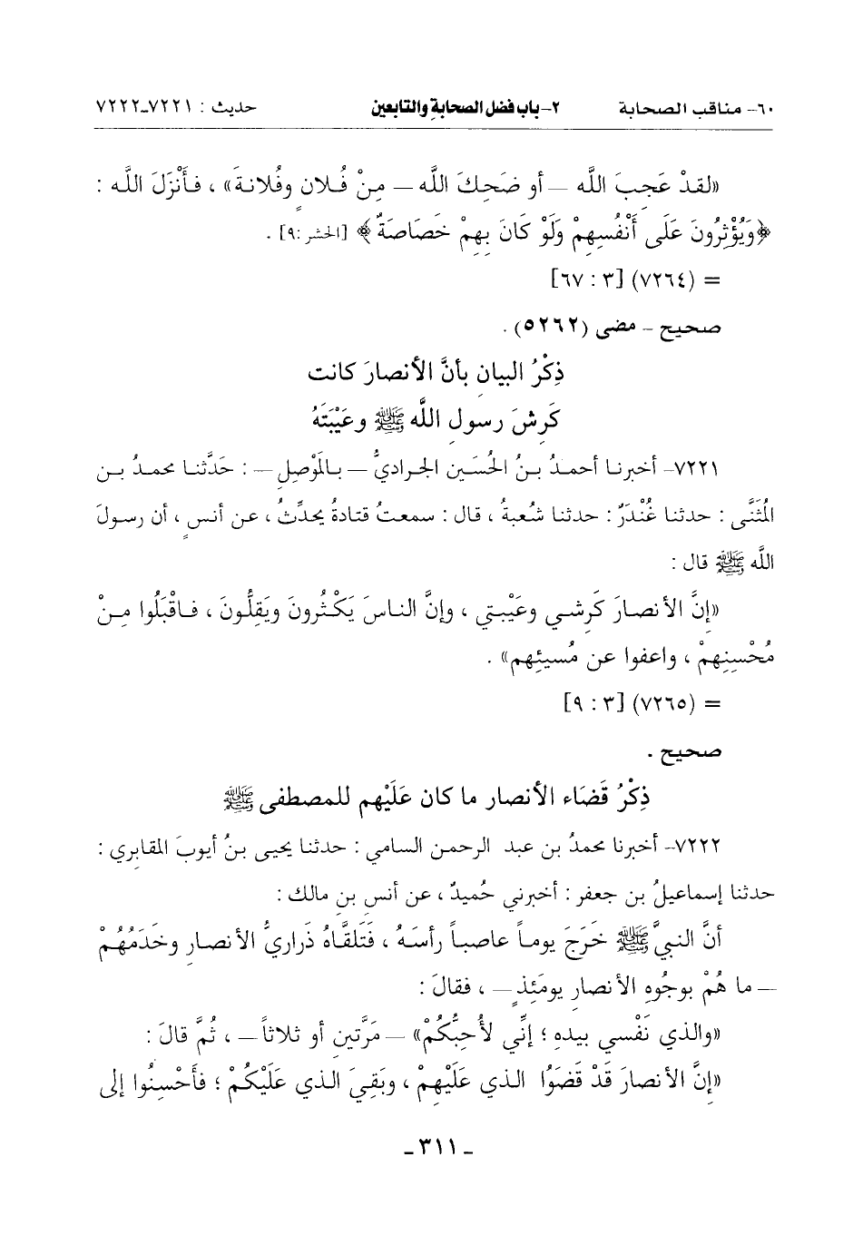 (إِنَّ الْأَنْصَارَ كَرِشي وَعَيْبَتِي وَإِنَّ النَّاسَ يكْثُرون ويَقِلُّون فَاقْبَلُوا من مُحسِنِهم واعفوا عن مُسيئهم)