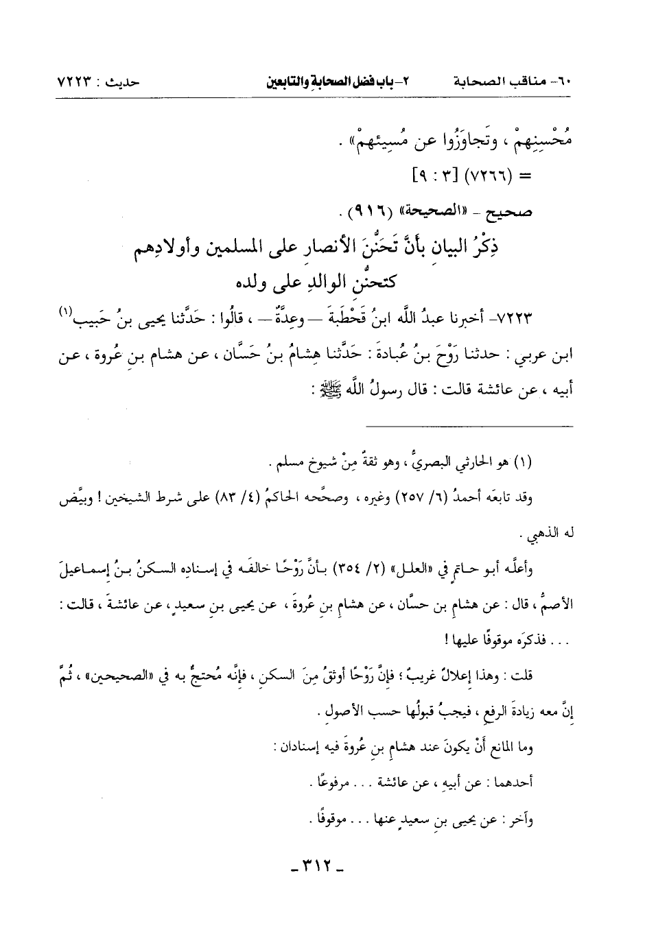 وأعله أبو حاتم في ((العلل)) (2/ 354) بأن رَوْحاً خالفه في إسناده السكنُ بن إسماعيل الأصم , قال عن هِشَامُ بْنُ حَسَّانَ , عَنْ هِشَامِ بْنِ عُرْوَةَ , عن يحيى بن سعيد , عن عائشة , قالت: .... فذكره موقوفاً عليها!