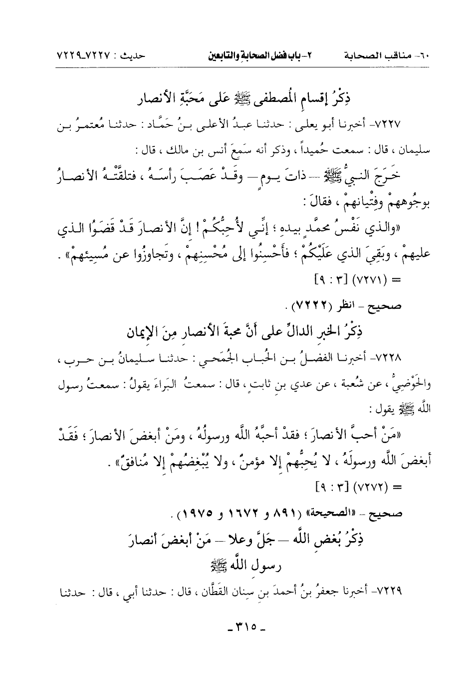 7227 - أَخْبَرَنَا أَبُو يَعْلَى حَدَّثَنَا عَبْدُ الْأَعْلَى بْنُ حَمَّادٍ حَدَّثَنَا مُعْتَمِرُ بْنُ سُلَيْمَانَ قَالَ: سَمِعْتُ حُمَيْدًا وَذَكَرَ أَنَّهُ سَمِعَ أَنَسَ بْنَ مَالِكٍ قَالَ: