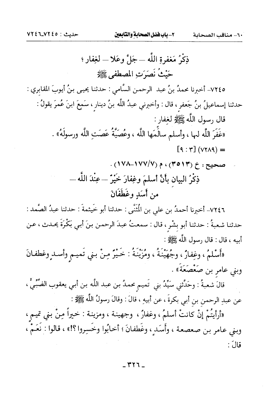 (أَرَأَيْتُمْ إِنْ كَانَتْ أَسْلَمُ وَغِفَارُ وَجُهَيْنَةُ وَمُزَيْنَةُ خَيْرًا مِنْ بَنِي تَمِيمٍ وَبَنِي عَامِرِ بْنِ صَعْصَعَةَ وَأَسَدٍ وَغَطَفَانَ أَخَابُوا وَخَسِرُوا)؟ قَالُوا: نَعَمْ قَالَ: -[327]-
