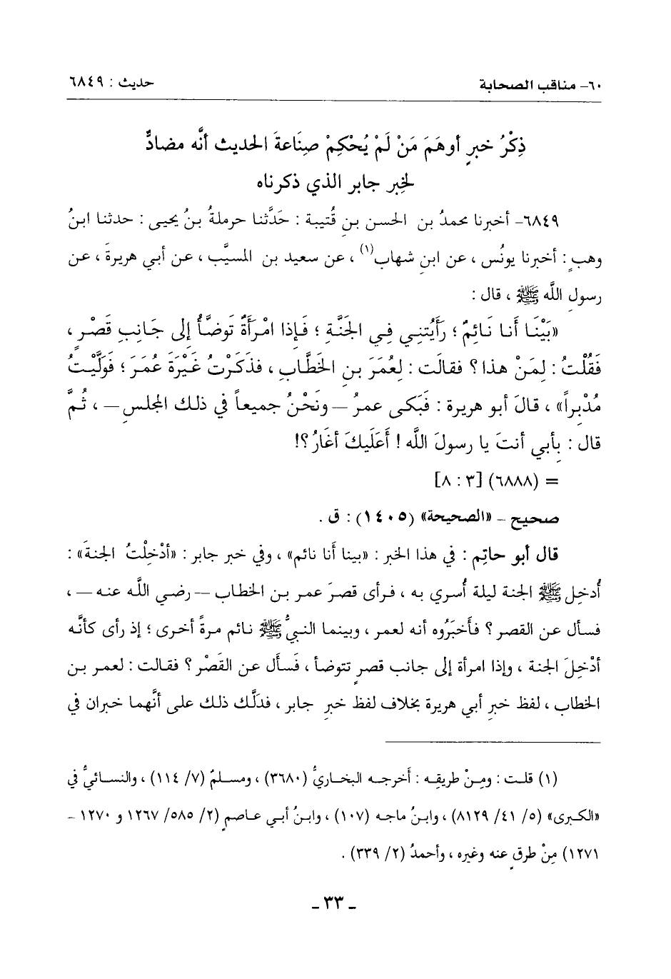 قَالَ أَبُو حَاتِمٍ: فِي هَذَا الْخَبَرِ: (بَيْنَا أَنَا نَائِمٌ) وَفِي خَبَرِ جَابِرٍ: (أُدخلت الْجَنَّةَ) أُدخل صَلَّى اللَّهُ عَلَيْهِ وَسَلَّمَ الْجَنَّةَ لَيْلَةَ أُسْرِيَ بِهِ فَرَأَى قَصْرَ عُمَرَ بْنِ الْخَطَّابِ رَضِيَ اللَّهُ عَنْهُ فَسَأَلَ عَنِ الْقَصْرِ فَأَخْبَرُوهُ أَنَّهُ لِعُمَرَ وَبَيْنَمَا النَّبِيُّ صَلَّى اللَّهُ عَلَيْهِ وَسَلَّمَ نَائِمٌ مَرَّةً أُخْرَى إِذْ رَأَى كَأَنَّهُ أُدْخِلَ الْجَنَّةَ وَإِذَا امْرَأَةٌ إِلَى جَانِبِ قَصْرٍ تَتَوَضَّأُ فَسَأَلَ عَنِ الْقَصْرِ فَقَالَتْ: لِعُمَرَ بْنِ الْخَطَّابِ لَفْظُ خَبَرِ أَبِي هُرَيْرَةَ بِخِلَافِ لَفْظِ خَبَرِ جَابِرٍ فَدَلَّكَ ذَلِكَ عَلَى أَنَّهُمَا خَبَرَانِ في -[34]- وقتين متباينين من غير أن يكون تضاد ولا تهاتر.