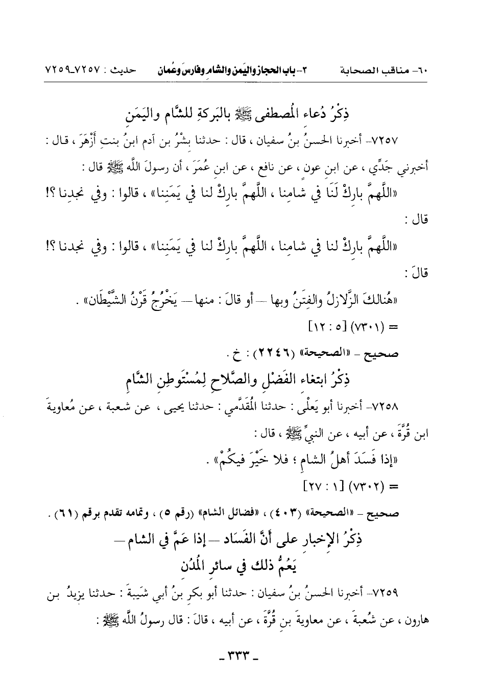 ذِكْرُ دُعَاءِ الْمُصْطَفَى صَلَّى اللَّهُ عَلَيْهِ وَسَلَّمَ بِالْبَرَكَةِ لِلشَّامِ وَالْيَمَنِ