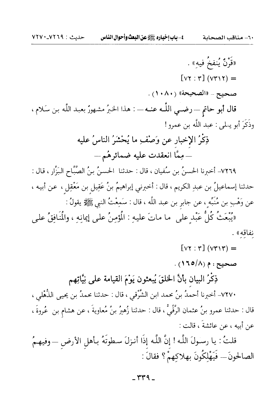 ذِكْرُ الْإِخْبَارِ عَنْ وَصْفِ مَا يُحشر النَّاسُ عَلَيْهِ مِمَّا انْعَقَدَتْ عَلَيْهِ ضَمَائِرُهُمْ