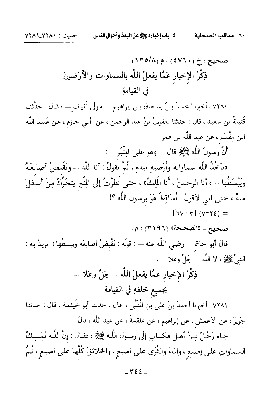 جَاءَ رَجُلٌ مِنْ أَهْلِ الْكِتَابِ إلى رسول الله صلى الله عليه وسلم فَقَالَ: إِنَّ اللَّهَ يُمْسِكُ السَّمَاوَاتِ عَلَى إِصْبَعٍ وَالْمَاءَ وَالثَّرَى عَلَى إِصْبَعٍ وَالْخَلَائِقَ كُلَّهَا عَلَى إِصْبَعٍ ثُمَّ -[345]- يَقُولُ: أَنَا الْمَلِكُ فَضَحِكَ رَسُولُ اللَّهِ حَتَّى بَدَتْ نَوَاجِذُهُ ثُمَّ قَرَأَ هَذِهِ الْآيَةَ {وَمَا قَدَرُوا اللَّهَ حَقَّ قَدْرِهِ وَالْأَرْضُ جميعاً قَبْضَتُهُ يوم القيامة والسماوات مطويات بيمينه سبحانه وتعالى عما يُشركون} [الزمر: 67]