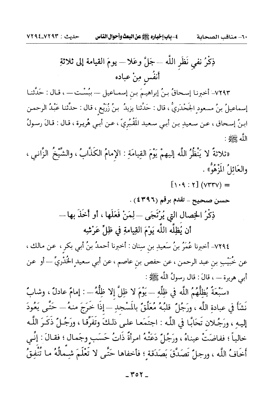 (سَبْعَةٌ يُظِلُّهُمُ اللَّهُ فِي ظِلِّهِ ـ يَوْمَ لَا ظِلَّ إِلَّا ظِلُّهُ ـ: إِمَامٌ عَادِلٌ وَشَابٌّ نَشَأَ فِي عُبَادَةِ اللَّهِ وَرَجُلٌ قَلْبُهُ مُعَلَّقٌ بِالْمَسْجِدِ ـ إِذَا خَرَجَ مِنْهُ ـ حَتَّى يَعُودَ إِلَيْهِ وَرَجُلَانِ تحابَّا فِي اللَّهِ اجْتَمَعَا عَلَى ذَلِكَ وتفرَّقا وَرَجُلٌ ذَكَرَ اللَّهَ خَالِيًا فَفَاضَتْ عَيْنَاهُ وَرَجُلٌ دَعَتْهُ امْرَأَةٌ ذَاتُ حَسَبٍ وَجَمَالٍ فَقَالَ: إِنِّي أَخَافُ اللَّهَ وَرَجُلٌ تَصَدَّقَ بِصَدَقَةٍ فَأَخْفَاهَا حَتَّى لَا تَعْلَمَ شِمَالُهُ مَا تُنْفِقُ -[353]- يمينه)