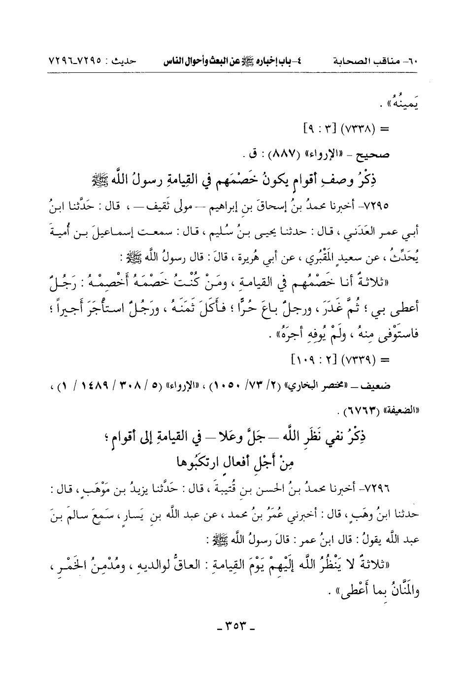 ذِكْرُ نَفْيِ نَظَرِ اللَّهِ جَلَّ وَعَلَا فِي الْقِيَامَةِ إِلَى أَقْوَامٍ مِنْ أَجْلِ أَفْعَالٍ ارْتَكَبُوهَا