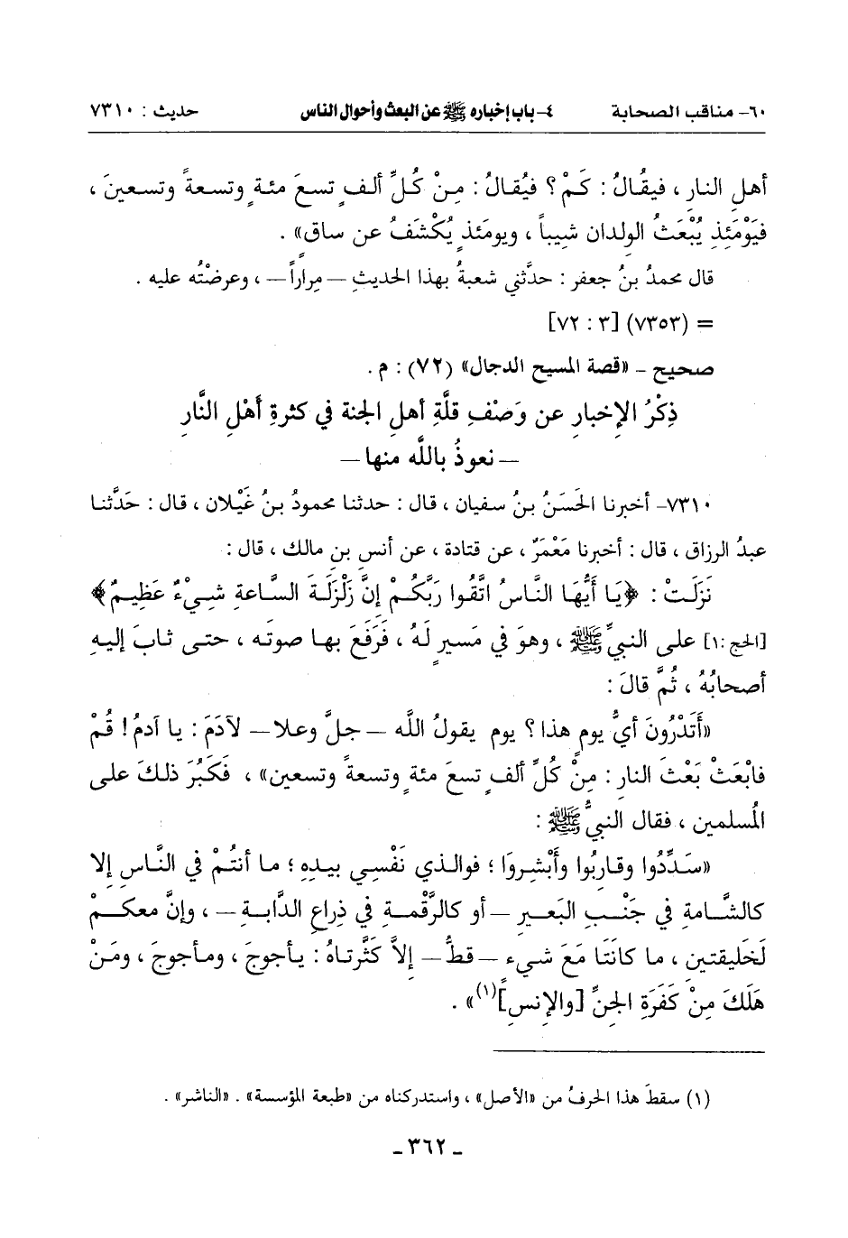 (سَدِّدُوا وَقَارِبُوا وَأَبْشِرُوا فَوَالَّذِي نَفْسِي بِيَدِهِ مَا أَنْتُمْ فِي النَّاسِ إِلَّا كَالشَّامَةِ فِي جَنْبِ الْبَعِيرِ ـ أَوْ كالرَّقْمة فِي ذِرَاعِ الدَّابَّةِ ـ وَإِنَّ مَعَكُمْ لَخَلِيقَتَيْنِ مَا كَانَتَا مَعَ شَيْءٍ ـ قَطُّ ـ إِلَّا كَثَّرتاه: يَأْجُوجَ وَمَأْجُوجَ وَمَنْ هَلَكَ مِنْ كَفَرَةِ الجِنِّ [والإنس] (¬1). -[363]-