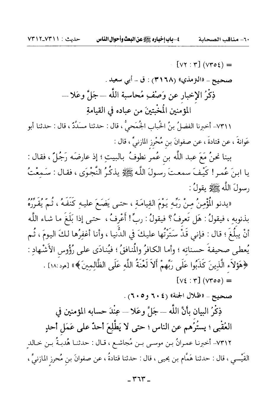 (إِنَّ اللَّهَ يُدْني الْمُؤْمِنَ مِنْهُ يَوْمَ الْقِيَامَةِ حَتَّى يَضَعَ كَنَفَهُ عَلَيْهِ فيَسْتُرَهُ مِنَ النَّاسِ فَيَقُولُ: أَتَعْرِفُ ذَنْبَ كَذَا وَكَذَا؟ فَيَقُولُ: نَعَمْ يَا رَبِّ فَيَقُولُ: أَتَعْرِفُ ذَنْبَ كَذَا وَكَذَا؟ فَيَقُولُ: نَعَمْ يَا رَبِّ حَتَّى إِذَا قَرَّرَهُ بِذُنُوبِهِ وَظَنَّ فِي نَفْسِهِ أَنَّهُ قَدِ اسْتَوْجَبَ قَالَ: قَدْ سَتَرْتُهَا عَلَيْكَ مِنَ النَّاسِ وَإِنِّي أَغْفِرُهَا لَكَ الْيَوْمَ ويُعطى كِتَابَ حَسَنَاتِهِ وَأَمَّا الْكُفَّارُ وَالْمُنَافِقُونَ فَيَقُولُ الْأَشْهَادُ: {هَؤُلَاءِ الَّذِينَ كَذَبُوا عَلَى رَبِّهِمْ أَلَا لَعْنَةُ اللَّهِ على الظالمين} [هود: 18]