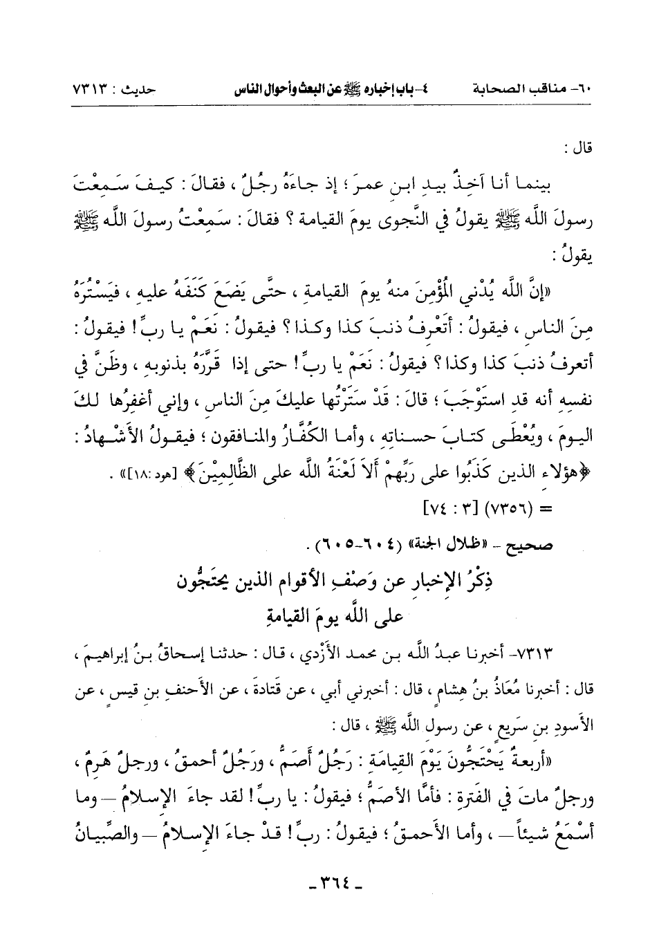 (أَرْبَعَةٌ يَحْتَجُّونَ يَوْمَ الْقِيَامَةِ: رَجُلٌ أَصَمُّ وَرَجُلٌ أَحْمَقُ وَرَجُلٌ هَرِمٌ وَرَجُلٌ مَاتَ فِي الْفَتْرَةِ فَأَمَّا الْأَصَمُّ فَيَقُولُ: يَا رَبِّ لَقَدْ جَاءَ الْإِسْلَامُ وَمَا أَسْمَعُ شَيْئًا وَأَمَّا الْأَحْمَقُ فَيَقُولُ: رَبِّ قَدْ جَاءَ الْإِسْلَامُ وَالصِّبْيَانُ -[365]- يحذِفُوني بِالْبَعَرِ وَأَمَّا الهَرِمَ فَيَقُولُ: رَبِّ لَقَدْ جَاءَ الْإِسْلَامُ وَمَا أَعْقِلُ وَأَمَّا الَّذِي مَاتَ فِي الْفَتْرَةِ فَيَقُولُ: رَبِّ مَا أَتَانِي لَكَ رَسُولٌ فَيَأْخُذُ مَوَاثِيقَهُمْ لَيُطيعُنَّه فيُرسل إِلَيْهِمْ رَسُولًا أَنِ ادْخُلُوا النَّارَ ـ قَالَ ـ: فَوَالَّذِي نَفْسِي بِيَدِهِ لَوْ دخلوها كانت عليهم برداً وسلاماً