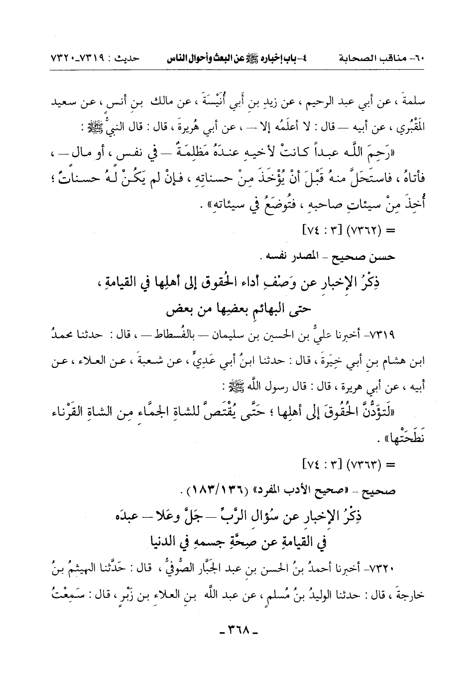 (لَتؤَدُّنَّ الْحُقُوقَ إِلَى أَهْلِهَا حَتَّى يُقْتَصَّ لِلشَّاةِ الجمَّاء مِنَ الشَّاةِ القَرْناء نَطَحَتْهَا)