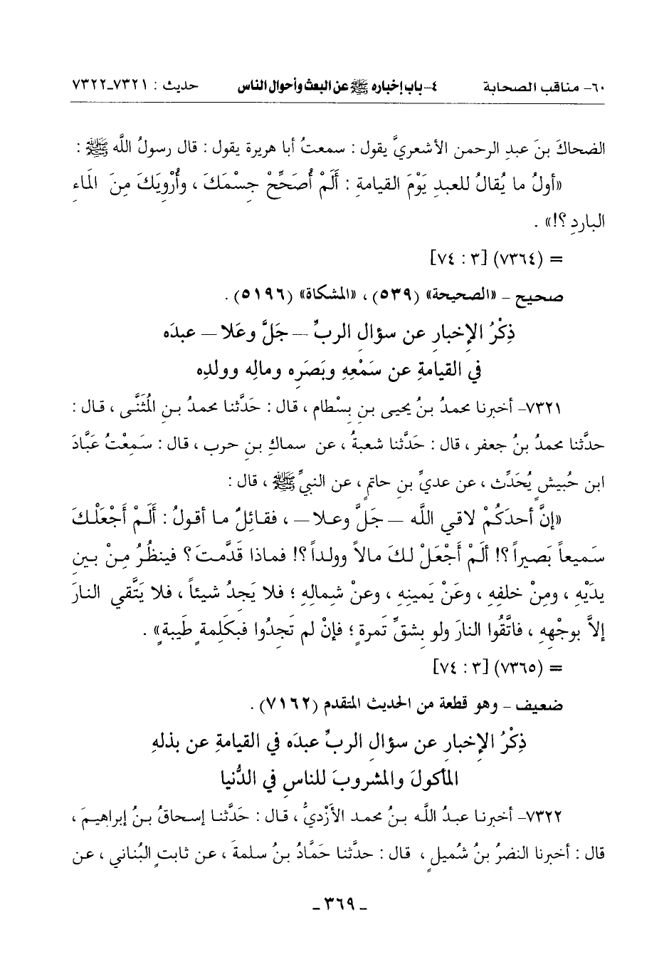 ذِكْرُ الْإِخْبَارِ عَنْ سُؤَالِ الرَّبِّ جَلَّ وَعَلَا عَبْدَهُ فِي الْقِيَامَةِ عَنْ سَمْعِهِ وَبَصَرِهِ وَمَالِهِ وولده