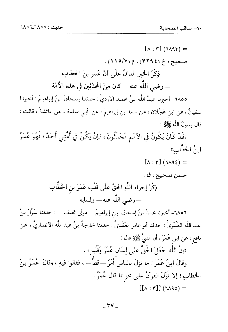 ذِكْرُ الْخَبَرِ الدَّالِّ عَلَى أَنَّ عُمَرَ بْنَ الْخَطَّابِ رَضِيَ اللَّهُ عَنْهُ كَانَ مِنَ المحدَّثين فِي هَذِهِ الْأُمَّةِ