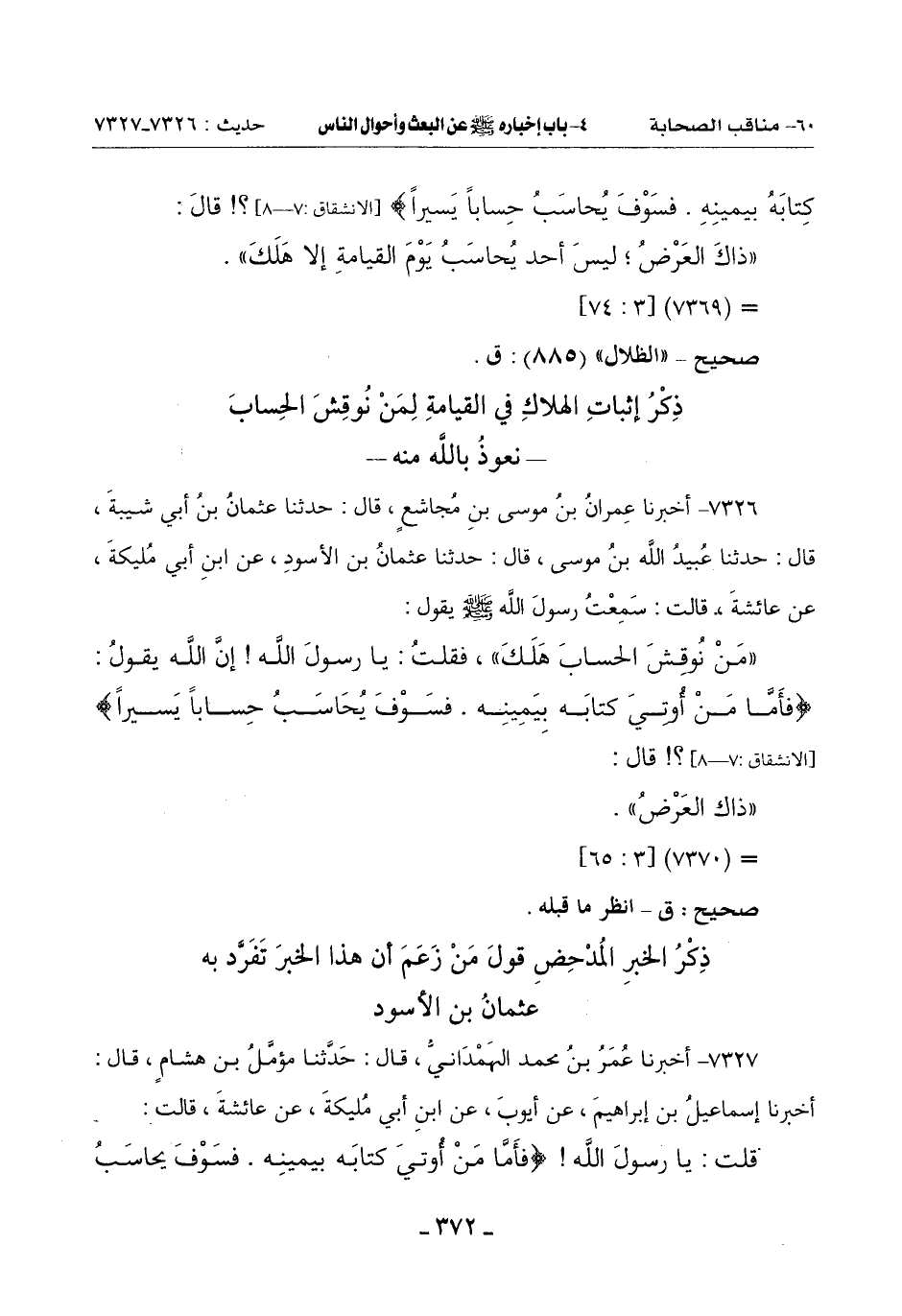 (مَنْ نُوقِشَ الْحِسَابَ هَلَكَ) فَقُلْتُ: يَا رَسُولَ اللَّهِ إِنَّ اللَّهَ يَقُولُ: {فَأَمَّا مَنْ أُوتِيَ كِتَابَهُ بِيَمِينِهِ * فَسَوْفَ يُحَاسَبُ حساباً يسيراً} [الانشقاق: 7 ـ 8]؟! قال: