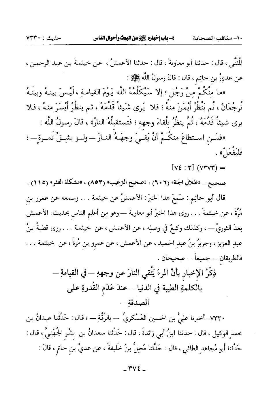 7330 - أَخْبَرَنَا عَلِيُّ بْنُ الْحُسَيْنِ الْعَسْكَرِيُّ بِالرَّقَّةِ قَالَ: حَدَّثَنَا عَبْدَانُ بْنُ مُحَمَّدٍ الْوَكِيلُ قَالَ: حَدَّثَنَا ابْنُ أَبِي زَائِدَةَ قَالَ: حَدَّثَنَا سَعْدَانُ بْنُ بِشْرٍ الْجُهَنِيُّ قَالَ: حَدَّثَنَا أَبُو مُجَاهِدٍ الطَّائِيُّ قَالَ: حَدَّثَنَا مُحِلُّ بْنِ خَلِيفَةَ عَنْ عَدِيِّ بْنِ حَاتِمٍ قَالَ: -[375]-