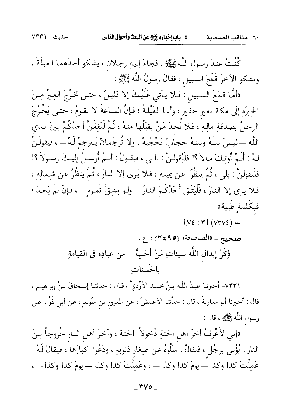 (إِنِّي لَأَعْرِفُ آخِرَ أَهْلِ الْجَنَّةِ دُخُولًا الْجَنَّةَ وَآخِرَ أَهْلِ النَّارِ خُرُوجًا مِنَ النَّارِ يُؤْتَى بِرَجُلٍ فَيُقَالُ: سَلُوهُ عَنْ صِغَارِ ذُنُوبِهِ وَدَعُوا كِبَارَهَا فَيُقَالُ لَهُ: عَمِلْتَ كَذَا وَكَذَا ـ يَوْمَ كَذَا وَكَذَا ـ وَعَمِلْتَ كَذَا وَكَذَا ـ يَوْمَ كَذَا وَكَذَا ـ -[376]- فَيَقُولُ: يَا رَبِّ قَدْ عَمِلْتُ أَشْيَاءَ لَا أَرَاهَا ههنا) قَالَ: فَلَقَدْ رَأَيْتُ النَّبِيَّ صَلَّى اللَّهُ عَلَيْهِ وَسَلَّمَ ضَحِكَ حَتَّى بَدَتْ نَوَاجِذُهُ قَالَ: