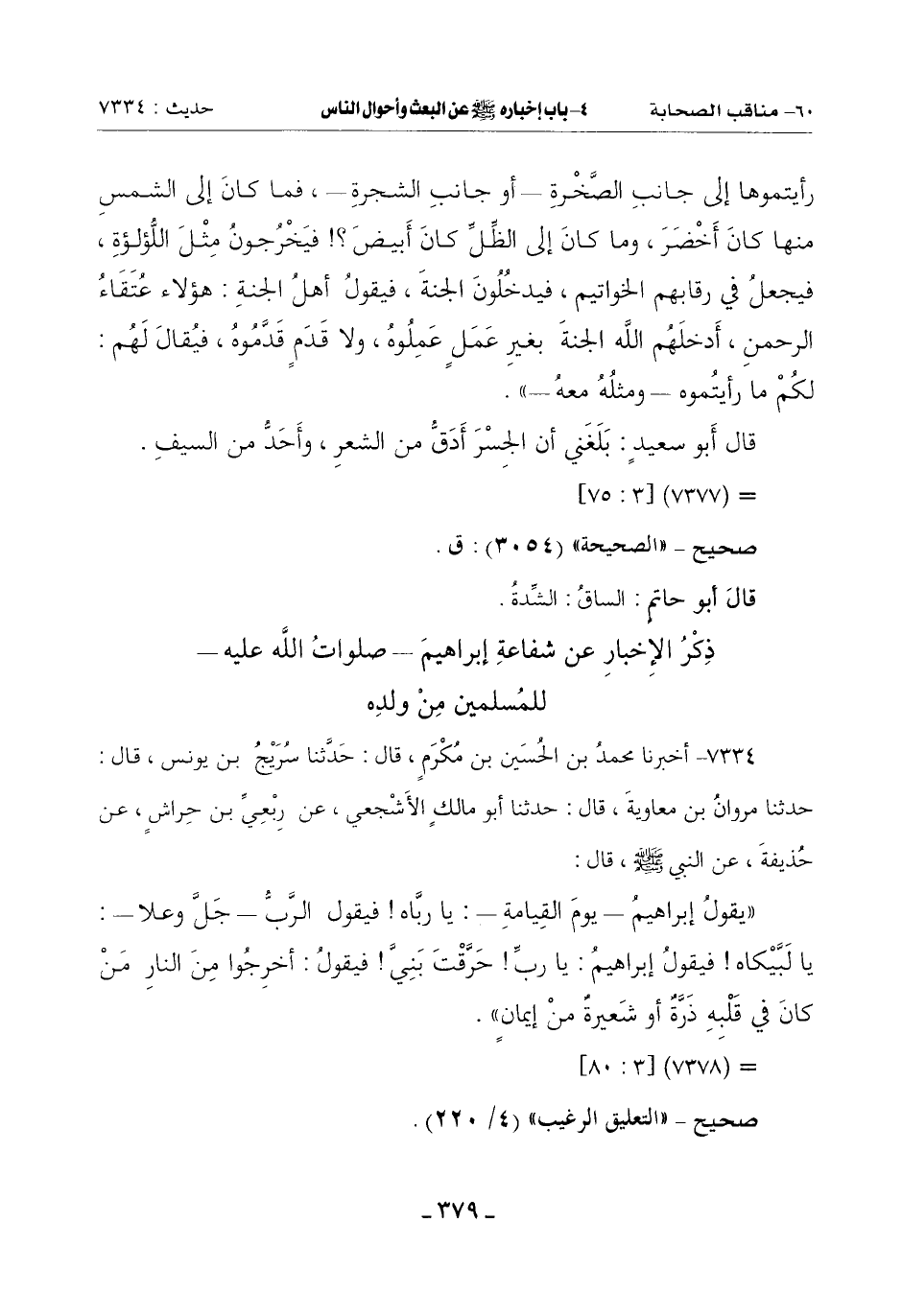 (يَقُولُ إِبْرَاهِيمُ يَوْمَ الْقِيَامَةِ: يَا رَبَّاهُ فَيَقُولُ الرَّبُّ جَلَّ وَعَلَا: يَا لَبَّيْكاه فَيَقُولُ إِبْرَاهِيمُ: يَا رَبِّ حَرَّقْتَ بنَّي فَيَقُولُ: أَخْرِجُوا مِنَ النَّارِ مَنْ كَانَ فِي قَلْبِهِ ذَرَّةٌ أَوْ شَعِيرَةٌ من إيمان)