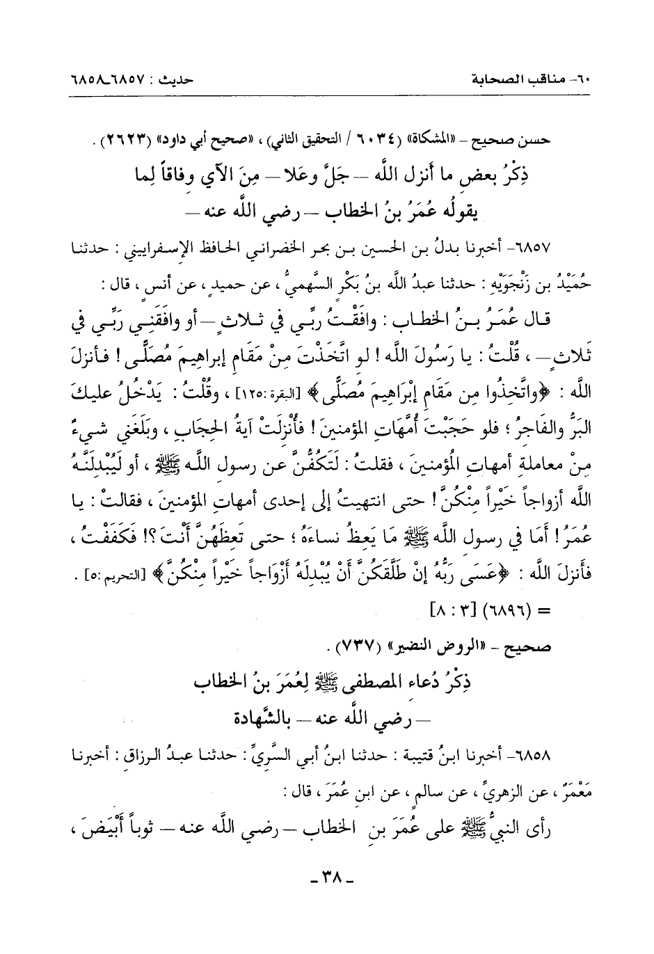 قَالَ عُمَرُ بْنُ الْخَطَّابِ: وَافَقْتُ رَبِّي فِي ثَلَاثٍ أَوْ وَافَقَنِي رَبِّي في ثلاث قلت: يارسول اللَّهِ لَوِ اتخذتَ مِنْ مَقَامِ إِبْرَاهِيمَ مُصَلًّى فَأَنْزَلَ اللَّهُ: {وَاتَّخِذُوا مِنْ مَقَامِ إِبْرَاهِيمَ مُصَلًّى} [البقرة: 125] وَقُلْتُ: يَدْخُلُ عَلَيْكَ الْبَرُّ وَالْفَاجِرُ فَلَوْ حجبتَ أُمَّهَاتِ الْمُؤْمِنِينَ فأُنزلت آيَةُ الْحِجَابِ وَبَلَغَنِي شَيْءٌ مِنْ مُعَامَلَةِ أُمَّهَاتِ الْمُؤْمِنِينَ فَقُلْتُ: لَتَكُفُّنَّ عَنْ رَسُولِ اللَّهِ صَلَّى اللَّهُ عَلَيْهِ وَسَلَّمَ أَوْ لَيُبْدِلَنَّهُ اللَّهُ أَزْوَاجًا خَيْرًا مِنْكُنَّ! حَتَّى انْتَهَيْتُ إِلَى إِحْدَى أُمَّهَاتِ الْمُؤْمِنِينَ فَقَالَتْ: يَا عُمَرُ أمَا فِي رَسُولِ اللَّهِ صَلَّى اللَّهُ عَلَيْهِ وَسَلَّمَ مَا يَعِظُ نِسَاءَهُ حَتَّى تَعِظَهُنَّ أَنْتَ فكففتُ فَأَنْزَلَ اللَّهَ: {عَسَى رَبُّهُ إِنْ طلَّقكنَّ أَنْ يُبْدِلَهُ أَزْوَاجًا خَيْرًا مِنْكُنَّ} [التحريم: 5].