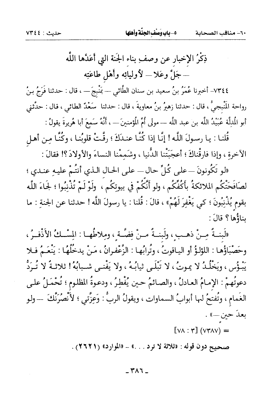 (لَوْ تَكُونُونَ عَلَى كُلِّ حَالٍ عَلَى الْحَالِ الَّذِي أَنْتُمْ عَلَيْهِ عِنْدِي لَصَافَحَتْكُمُ الْمَلَائِكَةُ بِأَكُفِّكُمْ وَلَوْ أَنَّكُمْ فِي بُيُوتِكُمْ وَلَوْ لَمْ تُذْنِبُوا لَجَاءَ اللَّهُ بِقَوْمٍ يُذْنِبُونَ كَيْ يَغْفِرَ لَهُمْ) قَالَ: قُلْنَا: يَا رَسُولَ اللَّهِ حَدِّثْنَا عَنِ الْجَنَّةِ مَا بِنَاؤُهَا؟ قَالَ: