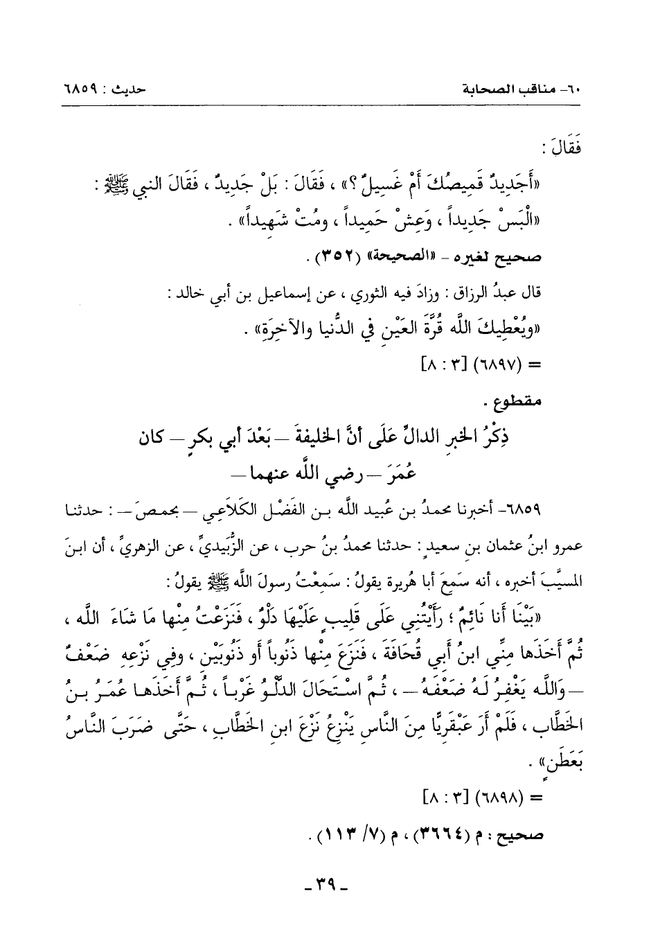(بَيْنَا أَنَا نَائِمٌ رأيتُني عَلَى قَلِيبٍ عَلَيْهَا دَلْوٌ فَنَزَعْتُ مِنْهَا مَا شَاءَ اللَّهُ ثُمَّ أَخَذَهَا مِنِّي ابْنُ أَبِي قُحَافَةَ فَنَزَعَ مِنْهَا ذَنُوباً أَوْ ذَنُوبَيْنِ وَفِي نزعِهِ ضَعْفٌ وَاللَّهُ يَغْفِرُ لَهُ ضَعْفَهُ ثُمَّ اسْتَحَالَ الدَّلْوُ غَرْبًا ثُمَّ أَخَذَهَا عمر بن الخطاب فلم أرى عبقرِياً مِنَ النَّاسِ يَنْزِعُ نَزْعَ ابْنِ الْخَطَّابِ حتى ضرب الناس بَعَطَنٍ)