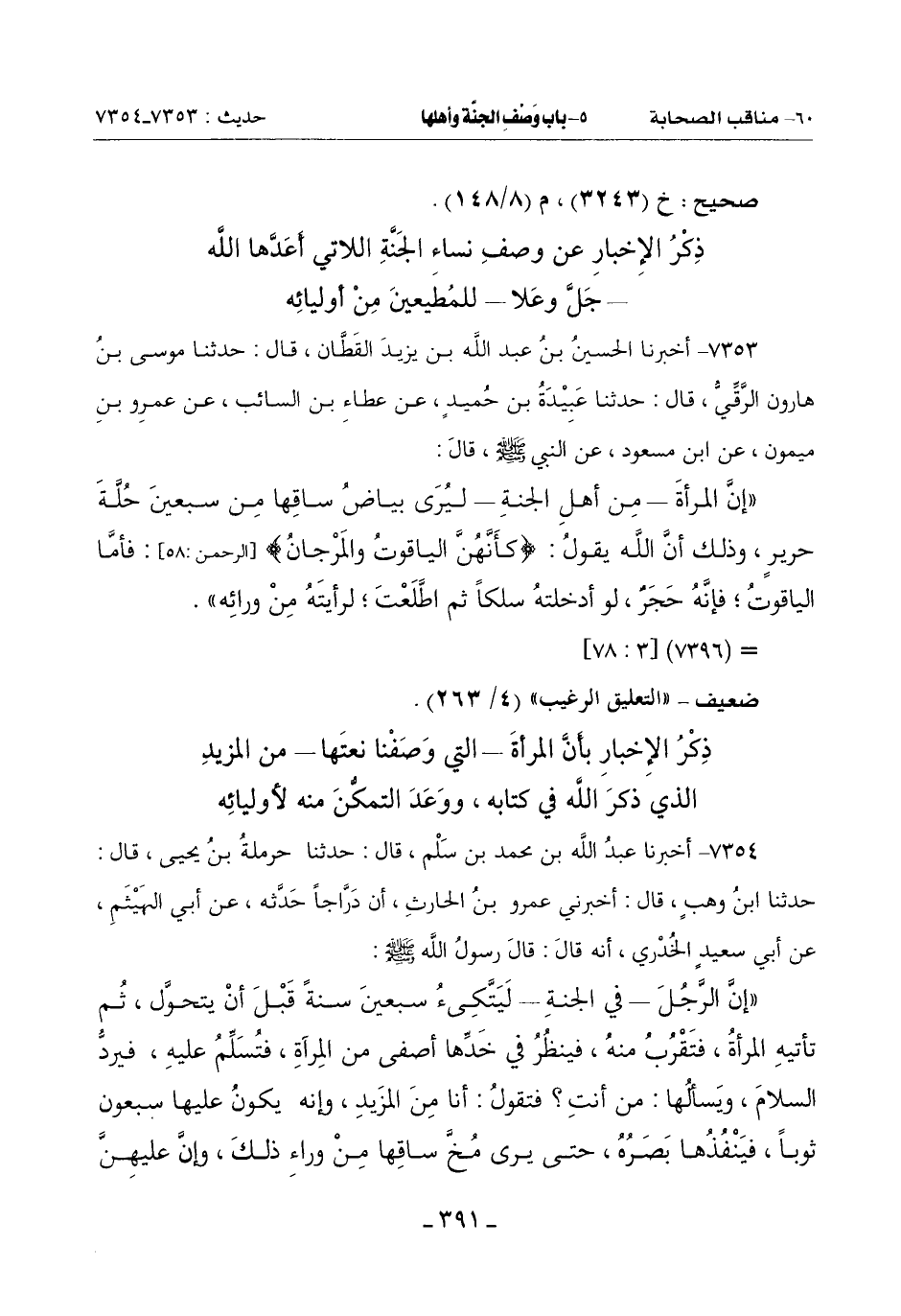 (إِنَّ الرَّجُلَ في الجنة ليتكىء سَبْعِينَ سَنَةً قَبْلَ أَنْ يَتَحَوَّلَ ثُمَّ تَأْتِيهِ الْمَرْأَةُ فتَقْرُبُ مِنْهُ فينظُرُ فِي خدَِّها أَصْفَى مِنَ الْمِرْآةِ فتُسَلِّمُ عَلَيْهِ فيردُّ السَّلَامَ ويَسألها مَنْ أَنْتِ؟ فَتَقُولُ: أَنَا مِنَ الْمَزِيدِ وَإِنَّهُ يَكُونُ عَلَيْهَا سَبْعُونَ ثَوْبًا فيَنْفُذُها بَصَرُهُ حَتَّى يَرَى مُخَّ سَاقِهَا مِنْ وَرَاءِ ذَلِكَ وَإِنَّ عَلَيْهِنَّ -[392]- التِّيجَانَ وَإِنَّ أَدْنَى لُؤْلُؤَةٍ عَلَيْهَا لَتُضيء ما بين المشرق والمغرب)
