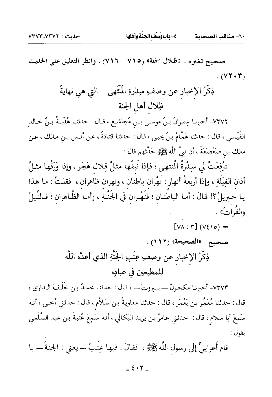 ذِكْرُ الْإِخْبَارِ عَنْ وَصْفِ سِدْرَةِ الْمُنْتَهَى الَّتِي هِيَ نِهَايَةُ ظِلَالِ أَهْلِ الْجَنَّةِ