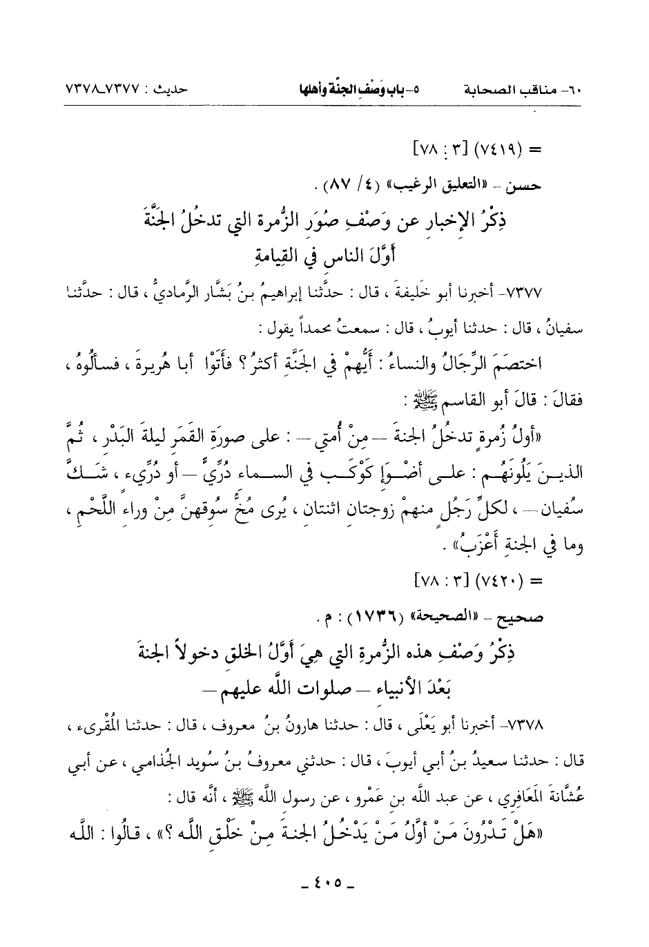 (أَوَّلُ زُمْرَةٍ تَدْخُلُ الْجَنَّةَ مِنَ أُمَّتِي عَلَى صُورَةِ الْقَمَرِ لَيْلَةَ الْبَدْرِ ثُمَّ الَّذِينَ يَلُونَهُمْ عَلَى أَضْوَأِ كَوْكَبٍ فِي السَّمَاءِ دُرِّيٍّ ـ أَوْ دُرِّيءٍ , شَكَّ سُفْيَانُ ـ لِكُلِّ رَجُلٍ مِنْهُمْ زَوْجَتَانِ اثْنَتَانِ يُرى مُخُّ سُوقِهِنَّ مِنْ وَرَاءِ اللَّحْمِ وَمَا فِي الْجَنَّةِ أَعْزُبُ)