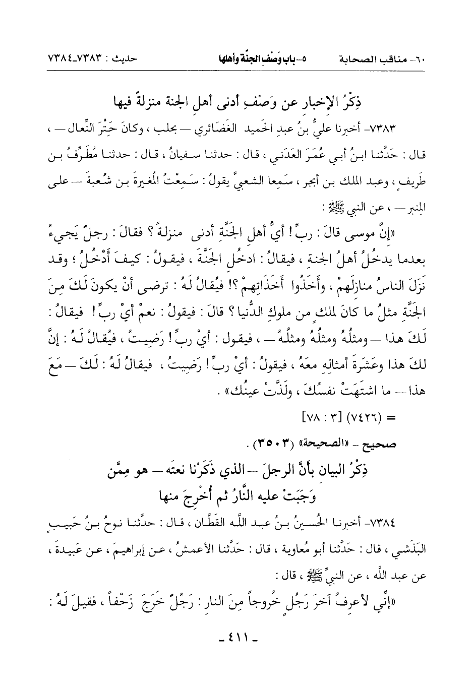 (إِنَّ مُوسَى قَالَ: رَبِّ أَيُّ أَهْلِ الْجَنَّةِ أَدْنَى مَنْزِلَةً؟ فَقَالَ: رَجُلٌ يَجِيءُ بَعْدَمَا يَدْخُلُ أَهْلُ الْجَنَّةَ فَيُقَالُ: ادْخُلِ الْجَنَّةَ فَيَقُولُ: كَيْفَ أَدْخَلُ وَقَدْ نَزَلَ النَّاسُ مَنَازِلَهُمْ وَأَخَذُوا أَخَذَاتِهِمْ فيُقال لَهُ: تَرْضَى أَنْ يَكُونَ لَكَ مِنَ الْجَنَّةِ مِثْلُ مَا كَانَ لِمَلِكٍ مِنْ مُلُوكِ الدُّنْيَا؟ قَالَ: فَيَقُولُ: نَعَمْ أَيْ رَبِّ فَيُقَالُ: لَكَ هَذَا ـ ومثلُهُ ومثلُهُ ومثلُهُ ـ فَيَقُولُ: أَيْ رَبِّ رضيتُ فيُقال لَهُ: إِنَّ لَكَ هَذَا وَعَشَرَةَ أَمْثَالِهِ مَعَهُ فَيَقُولُ: أَيْ رَبِّ رَضِيتُ فَيُقَالُ لَهُ: لَكَ ـ مَعَ هَذَا ـ مَا اشْتَهَتْ نَفْسُكَ ولَذَّتْ عينُك)