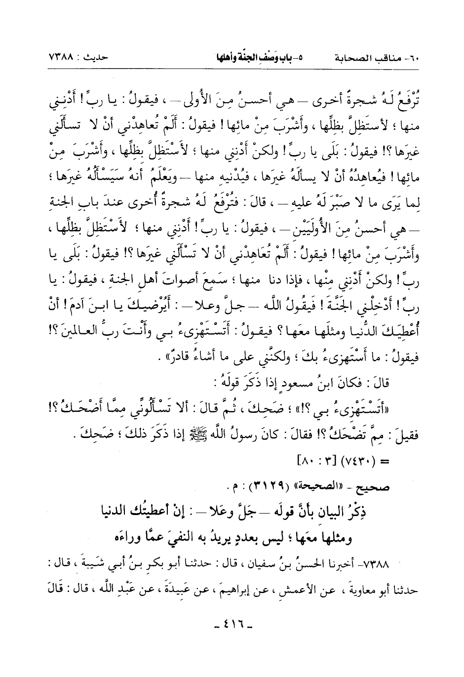 (إِنِّي لَأَعْرِفُ آخِرَ أَهْلِ النَّارِ خُرُوجًا مِنَ النَّارِ رَجُلٌ يَخْرُجُ مِنْهَا زَحْفًا فيُقال لَهُ: انْطَلِقْ فَادْخُلِ الْجَنَّةَ قَالَ: فَيَذْهَبُ فَيَدْخُلُ فَيَجِدُ النَّاسَ قَدِ أَخَذُوا الْمَنَازِلَ قَالَ: فَيَرْجِعُ فَيَقُولُ: يَا رَبِّ قَدْ أَخَذَ النَّاسُ الْمَنَازِلَ قَالَ: فَيُقَالُ لَهُ: أَتَذْكُرُ الزَّمَانَ الَّذِي كُنْتَ فِيهِ فِي الدُّنْيَا؟ قَالَ: فَيَقُولُ: نَعَمْ فيُقال لَهُ: تَمَنَّ فيَتَمَنَّى فيُقال لَهُ: لَكَ الَّذِي تَمَنَّيْتَ وَعَشَرَةَ أَضْعَافِ الدُّنْيَا قَالَ: فَيَقُولُ: أَتَسْخَرُ بِي وَأَنْتَ الْمَلِكُ)؟