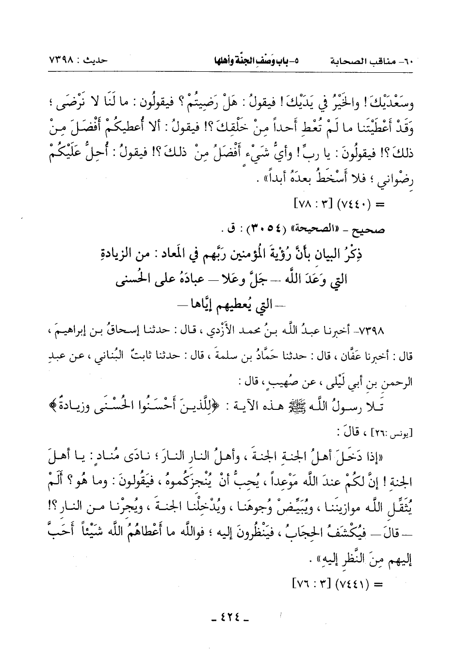 (إِذَا دَخَلَ أَهْلُ الْجَنَّةِ الْجَنَّةَ وَأَهْلُ النَّارِ النَّارَ نَادَى منادٍ: يَا أَهْلَ الْجَنَّةِ إِنَّ لَكُمْ عِنْدَ اللَّهِ مَوْعِدًا يُحِبُّ أَنْ يُنْجِزَكُموهُ فَيَقُولُونَ: وَمَا هُوَ؟ أَلَمْ يُثَقِّلِ اللَّهُ مَوَازِينَنَا ويُبَيِّضْ وُجُوهَنَا ويُدْخِلْنا الْجَنَّةَ ويُجِرْنا مِنَ النَّارِ؟ قَالَ: فيُكْشَفُ الْحِجَابُ فيَنْظُرونَ إِلَيْهِ فَوَاللَّهِ مَا أَعْطَاهُمُ اللَّهُ شيئاً أحب إليهم من النظر إليه)