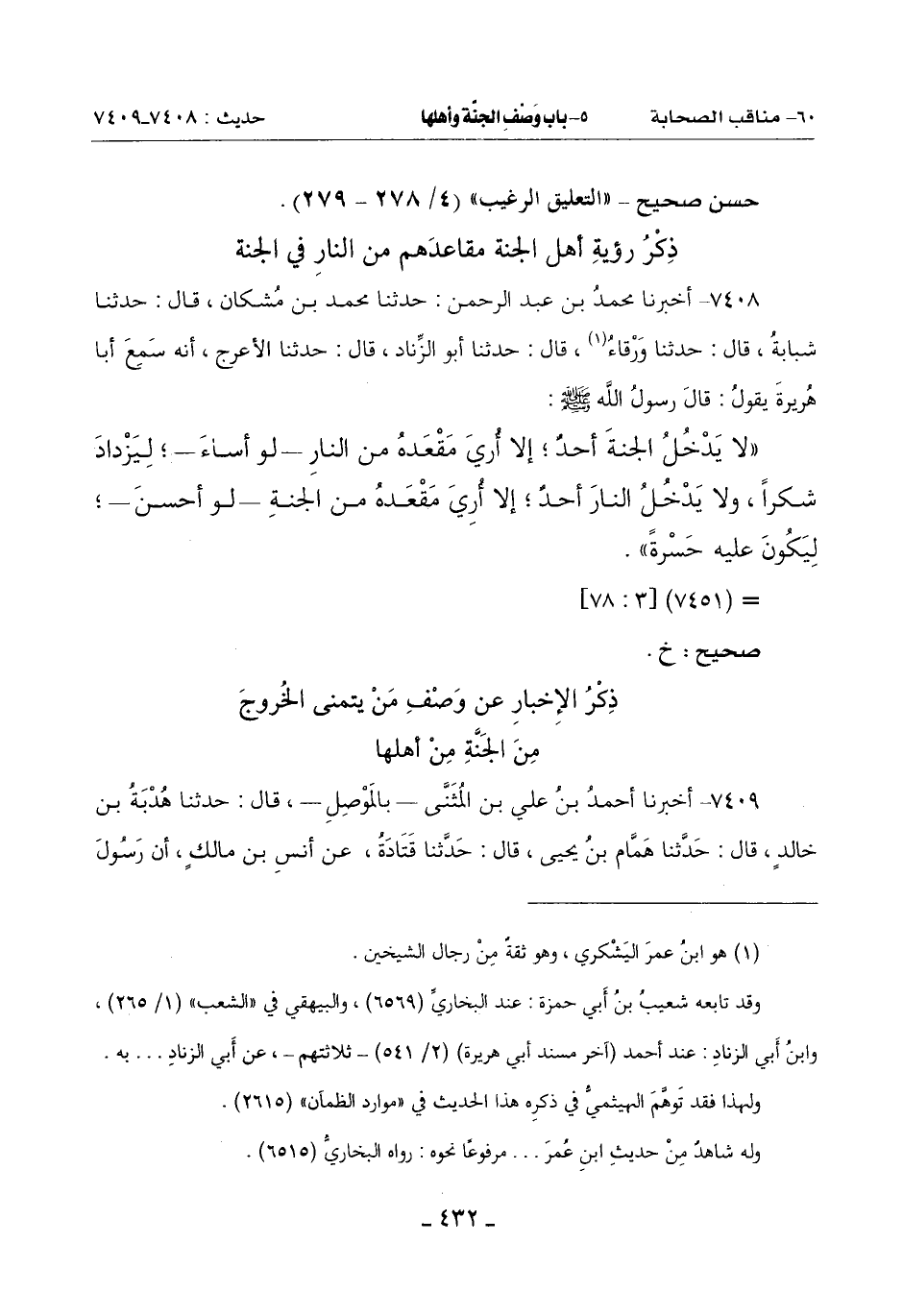 (لَا يَدْخُلُ الْجَنَّةَ أَحَدٌ إِلَّا أُري مَقْعَدَهُ مِنَ النَّارِ لَوْ أَسَاءَ لِيَزْدَادَ شُكْرًا وَلَا يَدْخُلُ النَّارَ أَحَدٌ إِلَّا أُري مَقْعَدَهُ مِنَ الْجَنَّةِ لَوْ أَحْسَنَ لِيَكُونَ عَلَيْهِ حسرة)