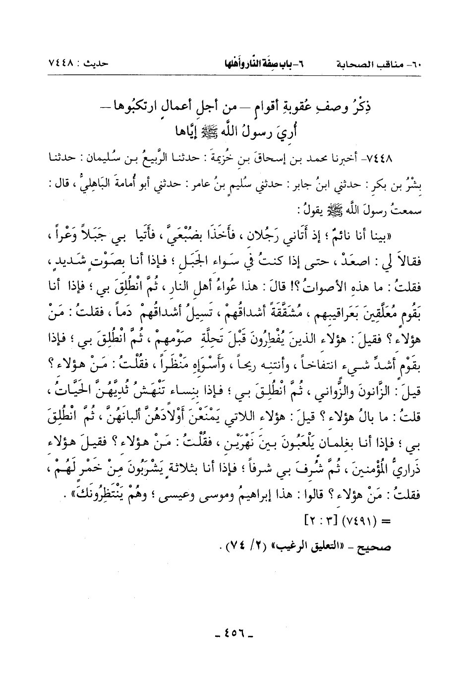 (بَيْنَا أَنَا نَائِمٌ إِذْ أَتَانِي رَجُلَانِ فَأَخَذَا بضُبْعَيَّ فَأَتَيَا بِي جَبَلًا وَعْراً فَقَالَا لِي: اصْعَدْ حَتَّى إِذَا كُنْتُ فِي سَوَاءِ الْجَبَلِ فَإِذَا أَنَا بِصَوْتٍ شَدِيدٍ فَقُلْتُ: مَا هَذِهِ الْأَصْوَاتُ؟ قَالَ: هَذَا عُواء أَهْلِ النَّارِ ثُمَّ انطُلق بِي فَإِذَا أَنَا بِقَوْمٍ مُعَلَّقِينَ بِعَرَاقِيبِهِمْ مُشَقَّقَةً أَشْدَاقُهُمْ تَسِيلُ أَشْدَاقُهُمْ دَمًا فَقُلْتُ: مَنْ هَؤُلَاءِ؟ فَقِيلَ: هَؤُلَاءِ الَّذِينَ يُفطرون قَبْلَ تَحِلَّةِ صَوْمِهِمْ ثُمَّ انْطُلق بِي فَإِذَا بِقَوْمٍ أَشَدِّ شَيْءٍ انتفاخاً وأنتنِه ريحاً وأسوإه مَنْظَرًا فَقُلْتُ: مَنْ هَؤُلَاءِ؟ قِيلَ: الزَّانُونَ وَالزَّوَانِي ثُمَّ انطُلق بِي فَإِذَا بِنِسَاءٍ تَنْهَشُ ثُدِيَّهُنَّ الْحَيَّاتُ قُلْتُ: مَا بَالُ هَؤُلَاءِ؟ قِيلَ هَؤُلَاءِ اللَّاتِي يَمْنَعْنَ أَوْلَادَهُنَّ أَلْبَانَهُنَّ ثُمَّ انْطُلق بِي فَإِذَا أَنَا بِغِلْمَانٍ يَلْعَبُونَ بَيْنَ نَهْرَيْنِ فَقُلْتُ: مَنْ هَؤُلَاءِ؟ فَقِيلَ هَؤُلَاءِ ذَرَارِيُّ الْمُؤْمِنِينَ ثُمَّ شُرِفَ بِي شَرَفًا فَإِذَا أَنَا بِثَلَاثَةٍ يَشْرَبُونَ مِنْ خمرٍ لَهُمْ فَقُلْتُ: مَنْ هَؤُلَاءِ؟ قَالُوا: هذا إبراهيم وموسى وعيسى وهم ينتظرونك)