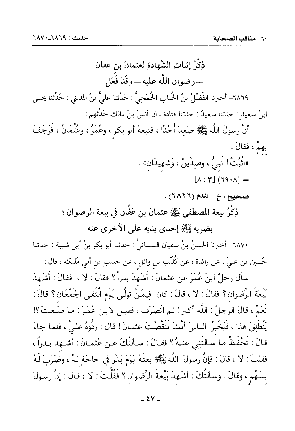 ذِكْرُ إِثْبَاتِ الشَّهَادَةِ لِعُثْمَانَ بْنِ عَفَّانَ رِضْوَانُ اللَّهِ عَلَيْهِ وَقَدْ فَعَلَ