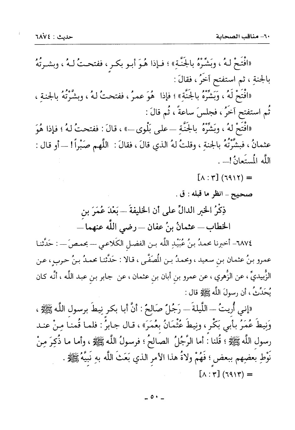 (إِنِّي أُريتُ اللَّيْلَةَ رجُلٌ صَالِحٌ أَنَّ أَبَا بَكْرٍ نِيطَ بِرَسُولِ اللَّهِ صَلَّى اللَّهُ عَلَيْهِ وَسَلَّمَ ونِيطَ عُمَرُ بِأَبِي بَكْرٍ ونِيطَ عُثْمَانُ بِعُمَرَ)