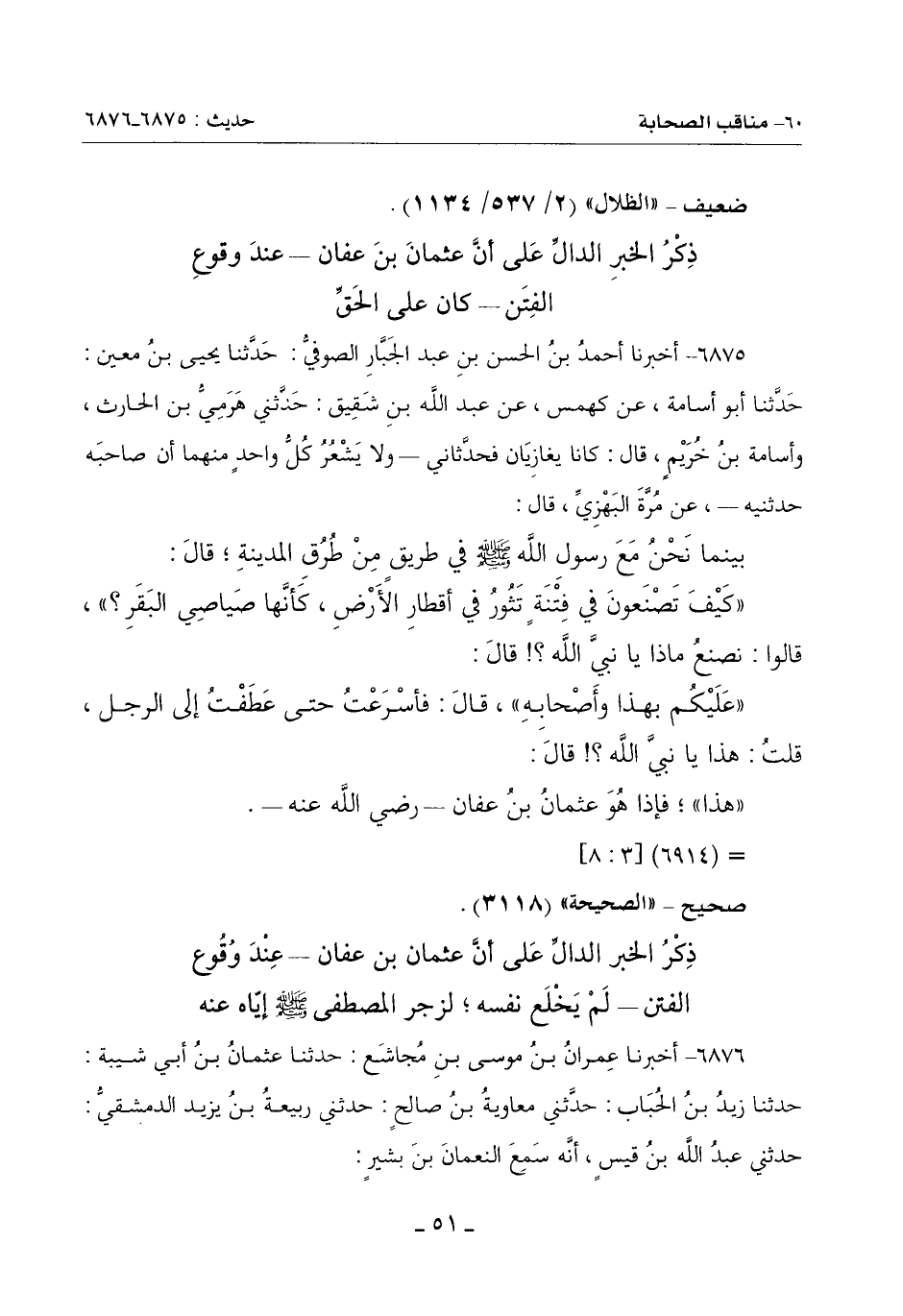 ذِكْرُ الْخَبَرِ الدَّالِّ عَلَى أَنَّ عُثْمَانَ بْنَ عَفَّانَ عِنْدَ وُقُوعِ الْفِتَنِ كَانَ عَلَى الْحَقِّ