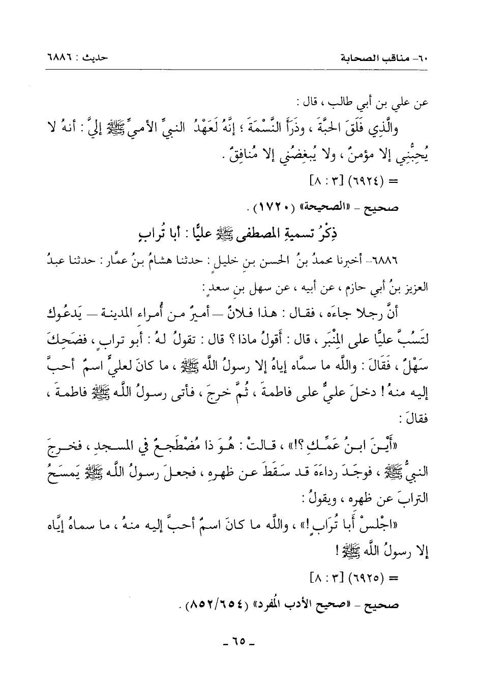 ذِكْرُ تَسْمِيَةِ الْمُصْطَفَى صَلَّى اللَّهُ عَلَيْهِ وَسَلَّمَ عَلِيًّا أَبَا تُرَابٍ