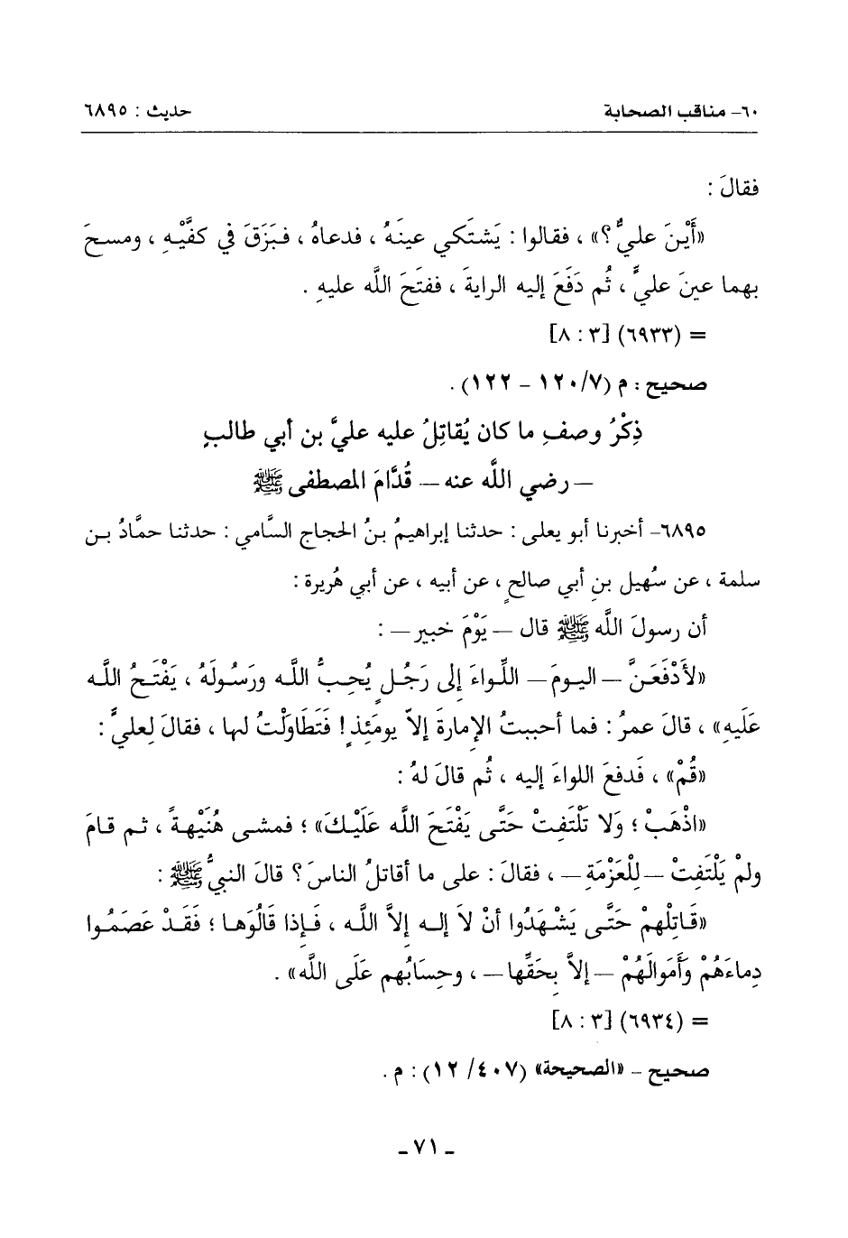 ذِكْرُ وَصْفِ مَا كَانَ يُقَاتِلُ عَلَيْهِ عَلِيِّ بْنِ أَبِي طَالِبٍ رَضِيَ اللَّهُ عَنْهُ قُدَّامَ الْمُصْطَفَى صَلَّى اللَّهُ عَلَيْهِ وَسَلَّمَ