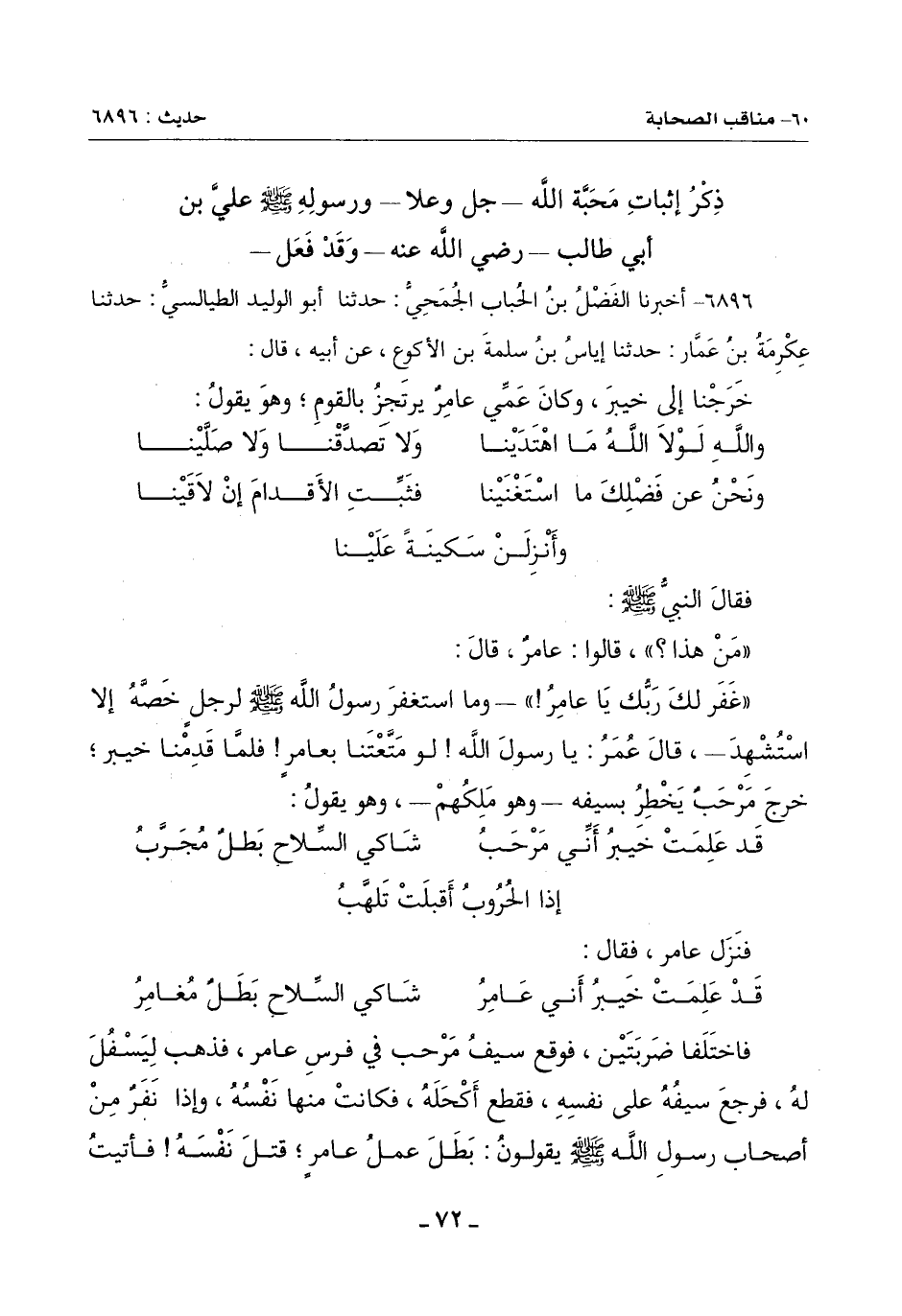 فَاخْتَلَفَا ضَرْبَتَيْنِ فَوَقَعَ سَيْفُ مَرْحَبٍ فِي فَرَسِ عَامِرٍ فَذَهَبَ لِيَسْفُلَ لَهُ فَرَجَعَ سَيْفُهُ عَلَى نَفْسِهِ فَقَطَعَ أَكْحَلَهُ فَكَانَتْ مِنْهَا نفسُهُ وَإِذَا نَفَرٍ مِنْ أَصْحَابِ رَسُولِ اللَّهِ صَلَّى اللَّهُ عَلَيْهِ وَسَلَّمَ يَقُولُونَ: بَطَلَ عَمَلُ عَامِرٍ قَتَلَ نَفْسَهُ فَأَتَيْتُ -[73]- النَّبِيَّ صَلَّى اللَّهُ عَلَيْهِ وَسَلَّمَ وَأَنَا أَبْكِي فَقُلْتُ: يارسول اللَّهِ بَطَلَ عملُ عَامِرٍ؟ فَقَالَ رَسُولُ اللَّهِ صَلَّى اللَّهُ عَلَيْهِ وَسَلَّمَ:
