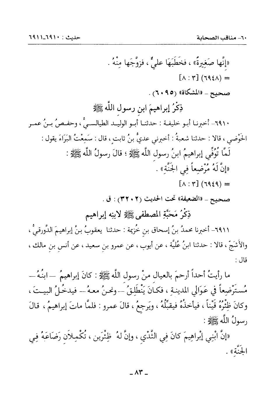 (إِنَّ ابْنِي إِبْرَاهِيمَ كَانَ فِي الثَّدْيِ وَإِنَّ له ظِئْرَين تُكْمِلانِ رَضَاعَه في الجنة) -[84]-