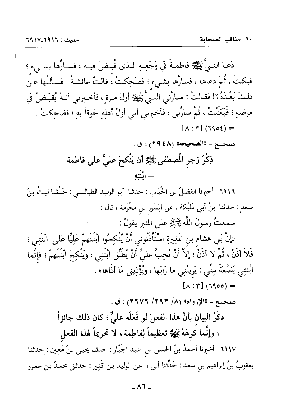 (إِنَّ فاطِمة مِنِّي وَإِنِّي أَخَافُ أَنْ تُفتن فِي دِينِها) وذَكَرَ صِهْرًا لَهُ مِنْ بَنِي عَبْدِ شَمْسٍ فَأَثْنَى عَلَيْهِ فِي مُصَاهَرَتِهِ فَأَحْسَنَ قَالَ: