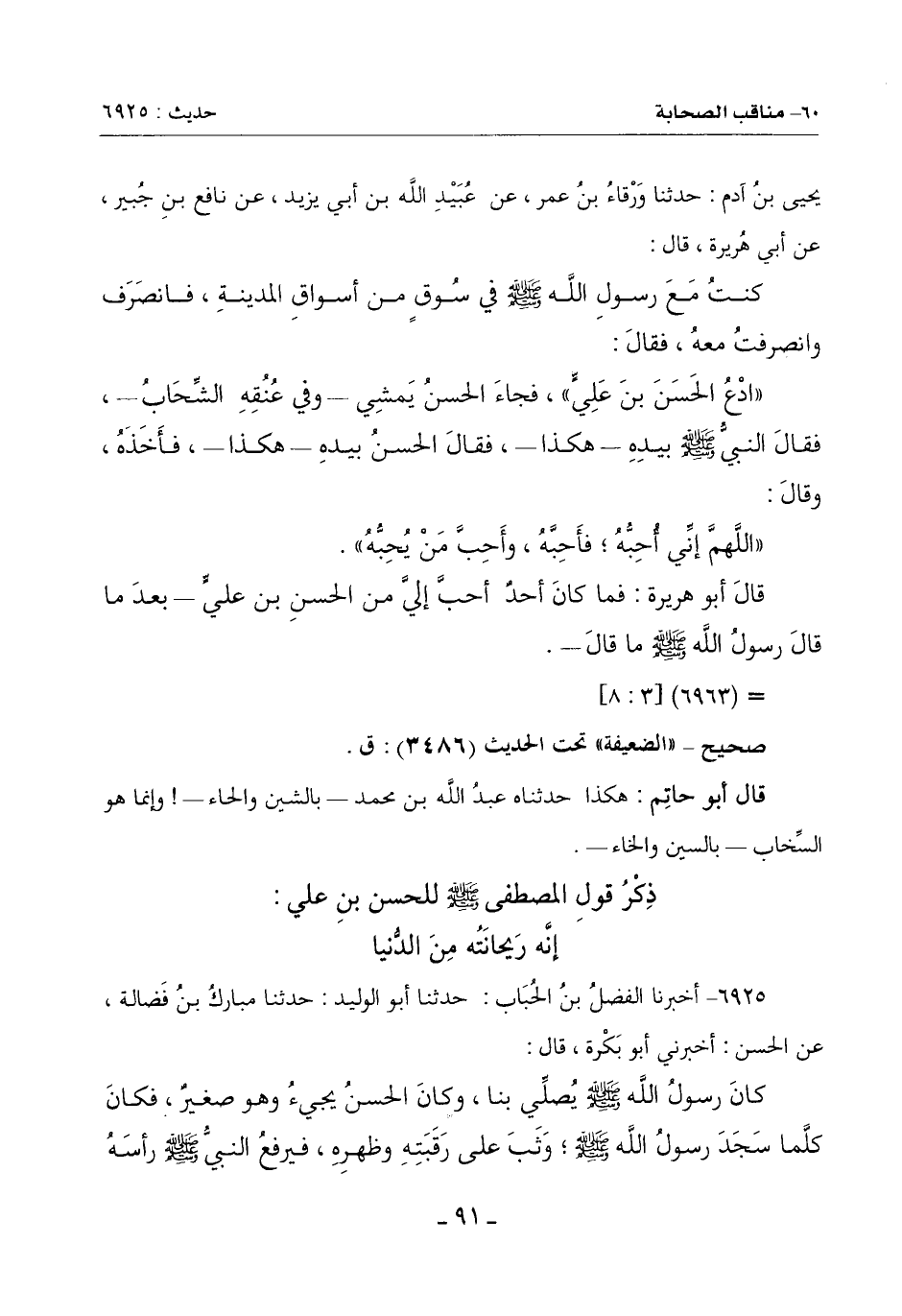 (إِنَّهُ رَيْحَانتي مِنَ الدُّنْيَا إِنَّ ابْنِي هَذَا سَيِّدٌ وَعَسَى اللَّهُ أَنْ يُصْلِحَ به بين فئتين من المسلمين)