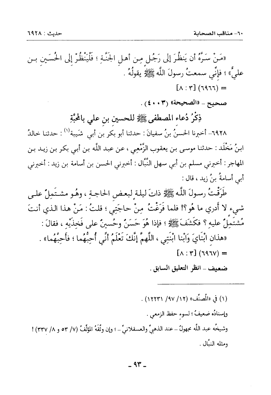 6928 - أَخْبَرَنَا الْحَسَنُ بْنُ سُفْيَانَ حَدَّثَنَا أَبُو بَكْرِ بْنُ أَبِي شَيْبَةَ (¬1) حَدَّثَنَا خَالِدُ بْنُ مَخْلَدٍ حَدَّثَنَا مُوسَى بْنُ يَعْقُوبَ الزَّمْعِيُّ عَنْ عَبْدِ اللَّهِ بْنِ أَبِي بَكْرِ بْنِ زَيْدِ بْنِ الْمُهَاجِرِ أَخْبَرَنِي مُسْلِمُ بْنُ أَبِي سَهْلٍ النَّبَّالُ أَخْبَرَنِي الْحَسَنُ بْنُ أُسَامَةَ بْنِ زَيْدٍ: أَخْبَرَنِي أَبِي أُسَامَةُ بْنُ زَيْدٍ قَالَ: